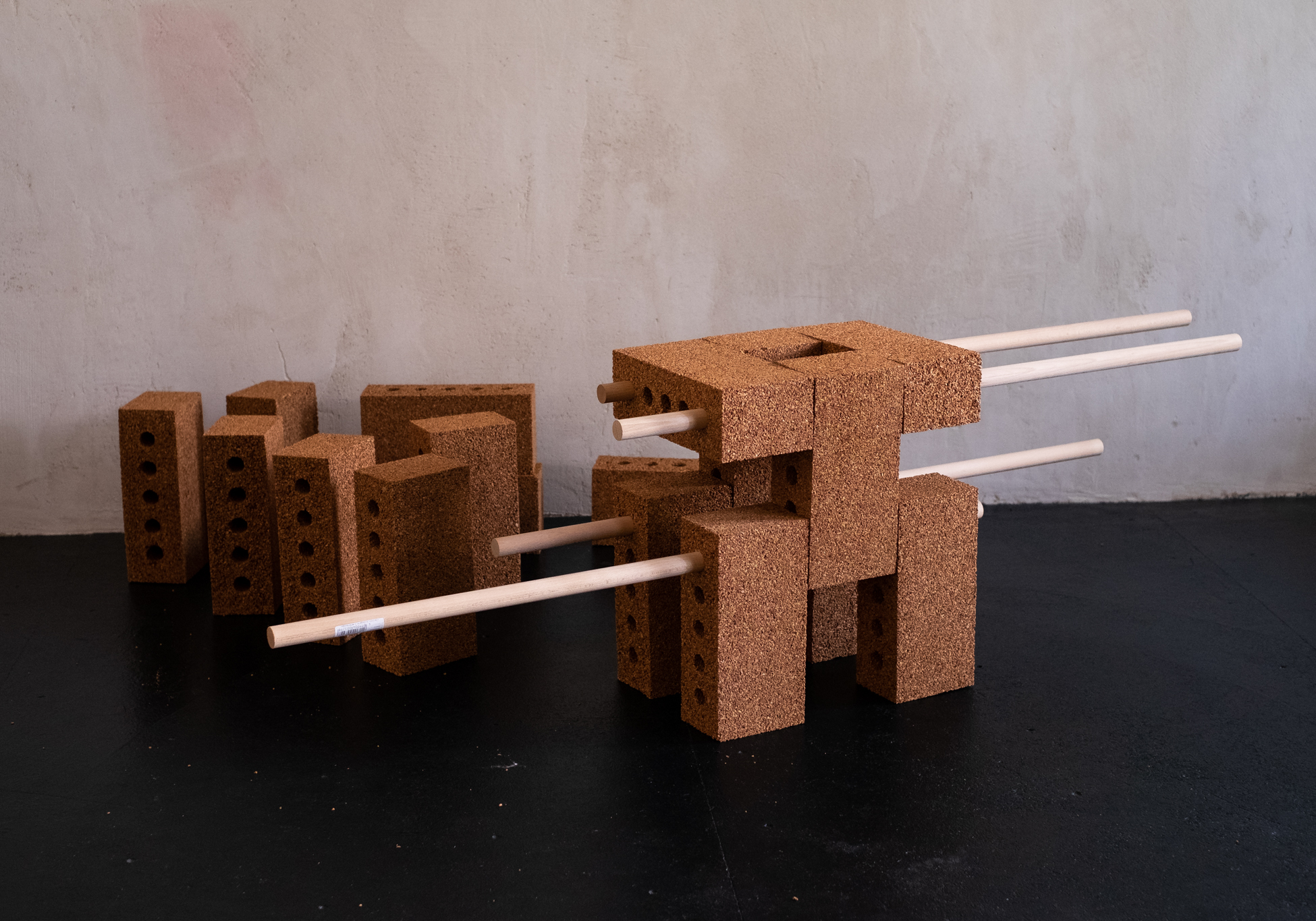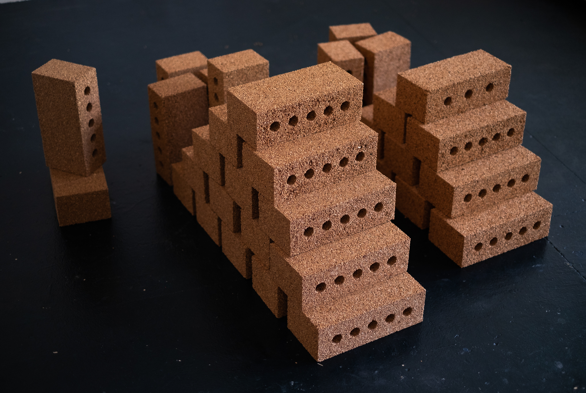 The resulting element makes use of the natural material characteristics of cork and uses them effectively to function in the system. The shape of the single element – inspired by the classic brick – considers the origin in many ways.