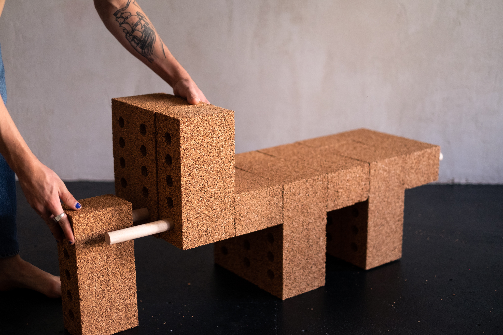 Das entstandene Element bedient sich der natürlichen Materialeigenschaften von Kork und nutzt sie effektiv, um in dem System zu funktionieren. Auch die Form des einzelnen Elementes – inspiriert durch den klassischen Mauerstein – berücksichtigt den Ursprung in vielerlei Hinsicht.