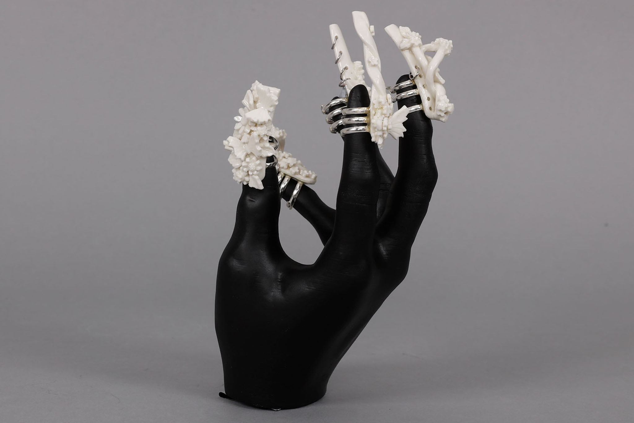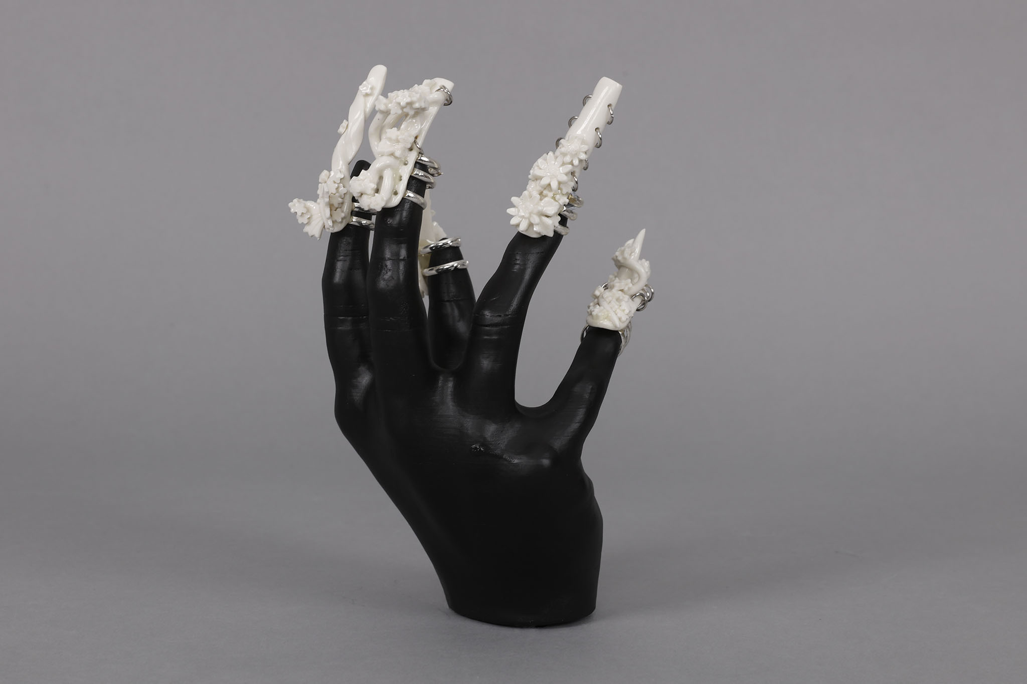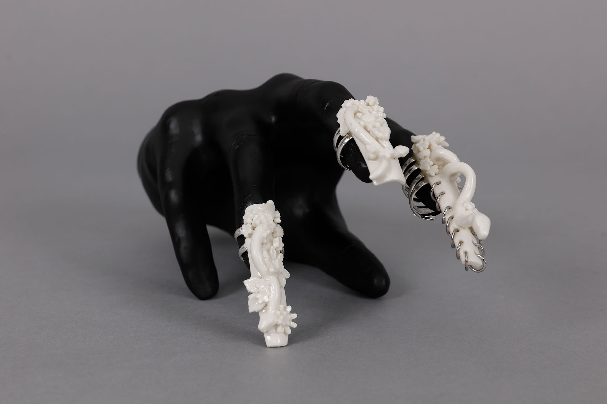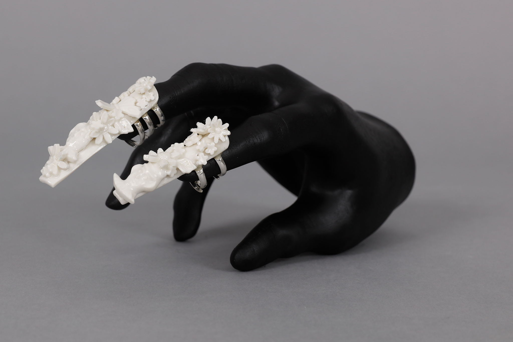 Away from acrylic nails towards luxurious porcelain accessories. A material study in which the difficulty lay in perceiving porcelain not only as a classic table decoration, but also as an accessory that adorns the body. Since nail studios use fast-hardening acrylic and can therefore glue anything to the nails, and have a wide range of design options, it does not mean that porcelain cannot implement the same properties. With the porcelain fingernails you don’t have to have your nails done again and again and there is no more wasting of materials, you put the nail on like a ring over your finger and the party can start.