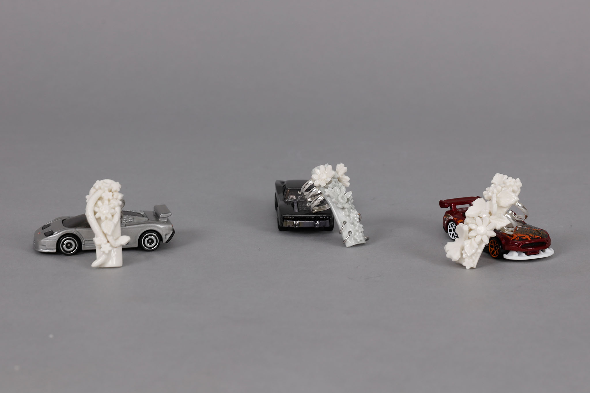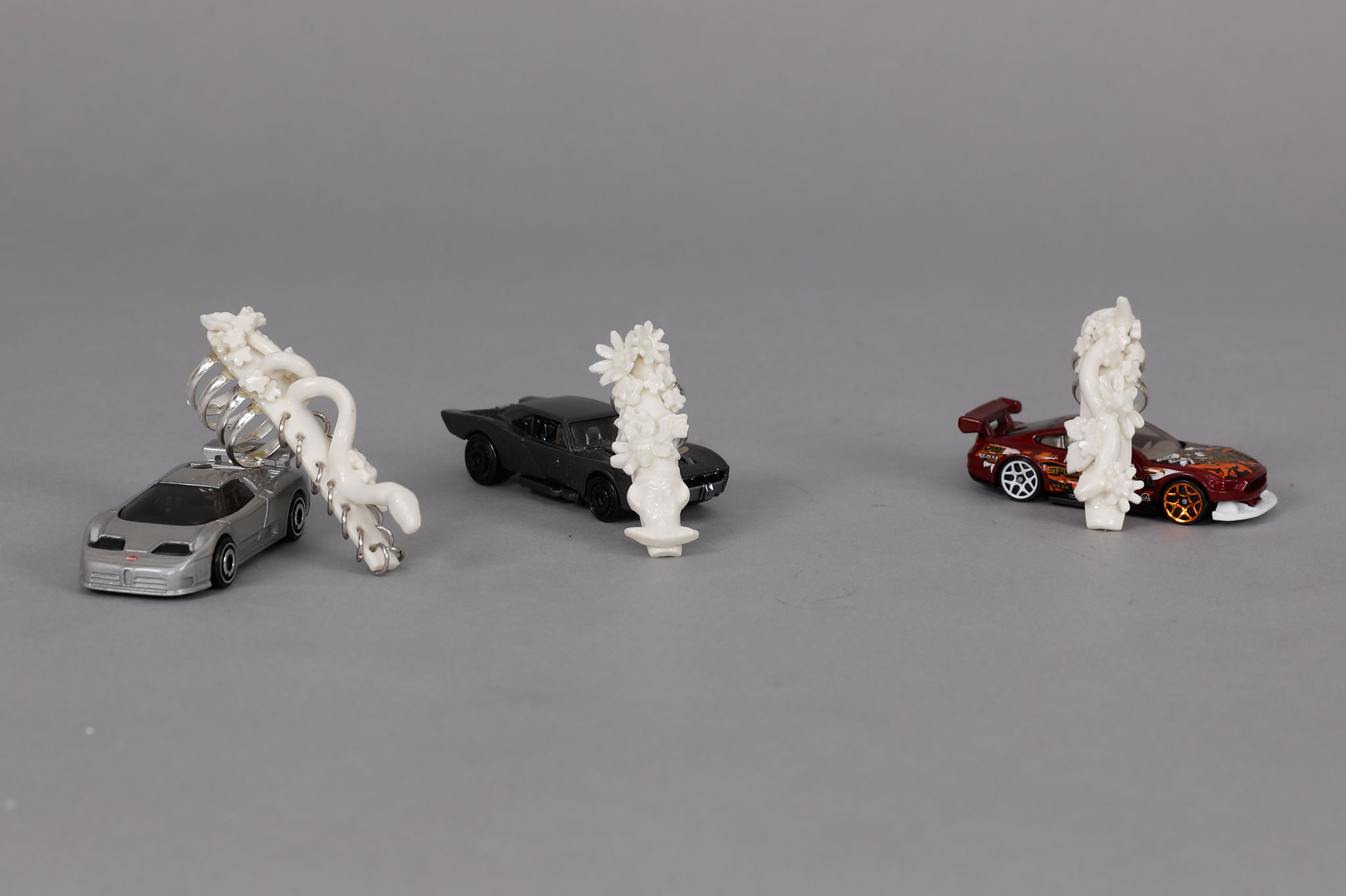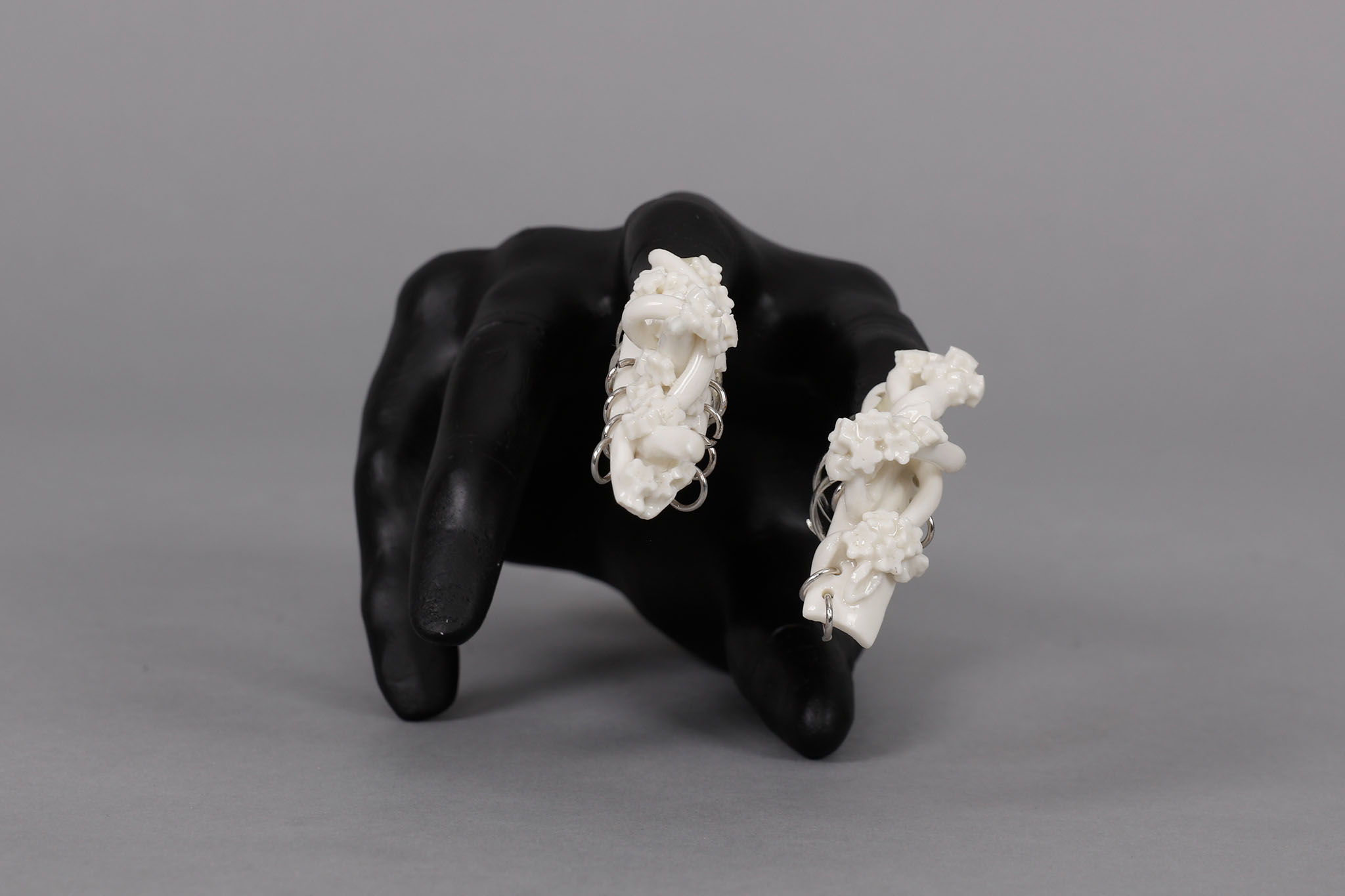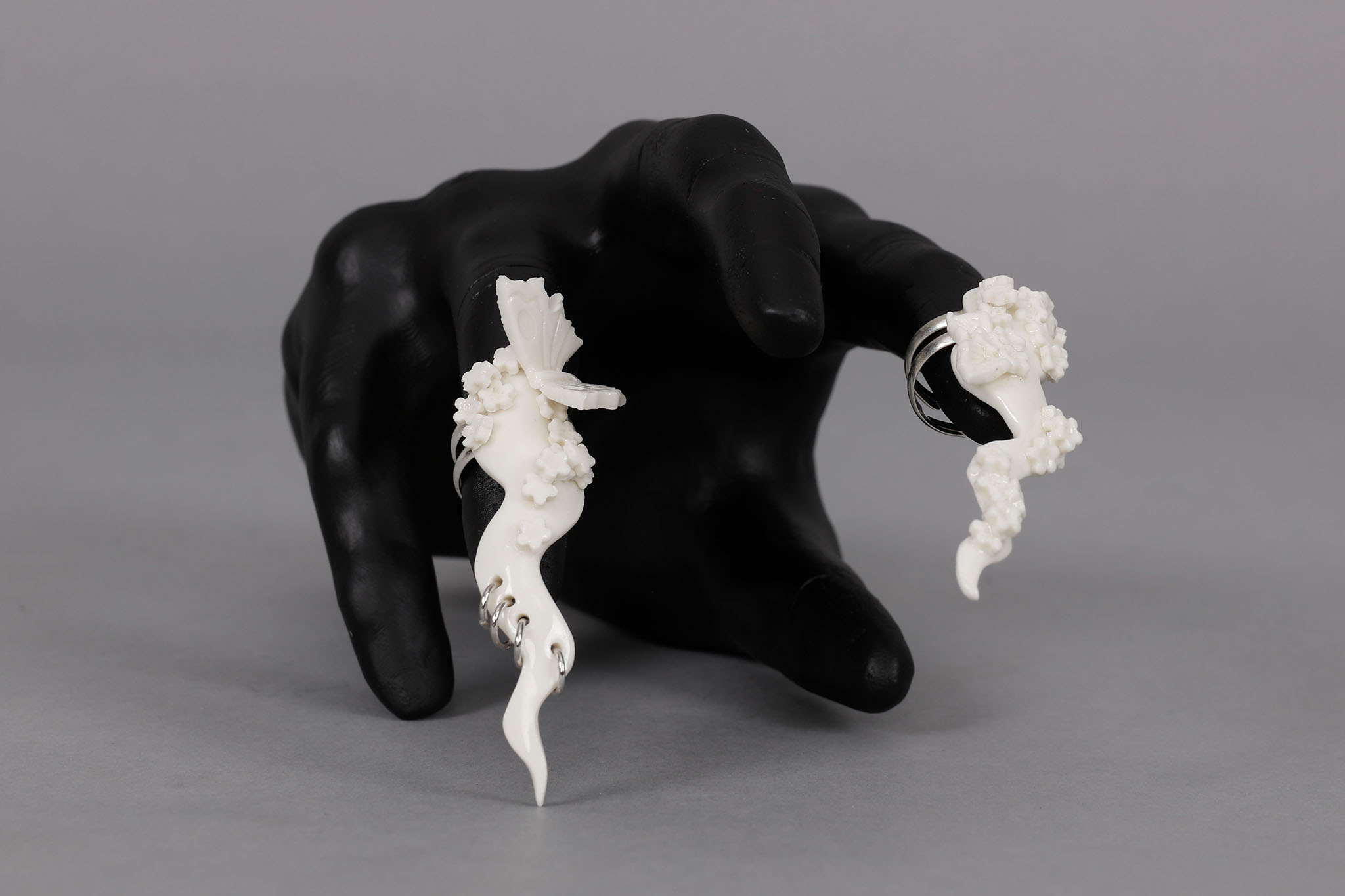 Away from acrylic nails towards luxurious porcelain accessories. A material study in which the difficulty lay in perceiving porcelain not only as a classic table decoration, but also as an accessory that adorns the body. Since nail studios use fast-hardening acrylic and can therefore glue anything to the nails, and have a wide range of design options, it does not mean that porcelain cannot implement the same properties. With the porcelain fingernails you don’t have to have your nails done again and again and there is no more wasting of materials, you put the nail on like a ring over your finger and the party can start.