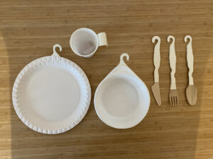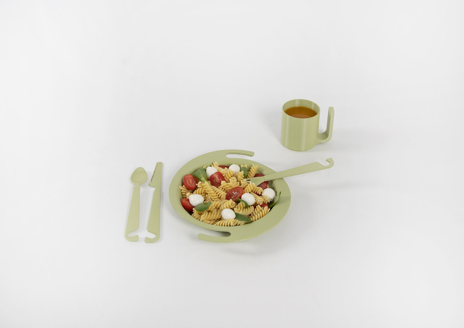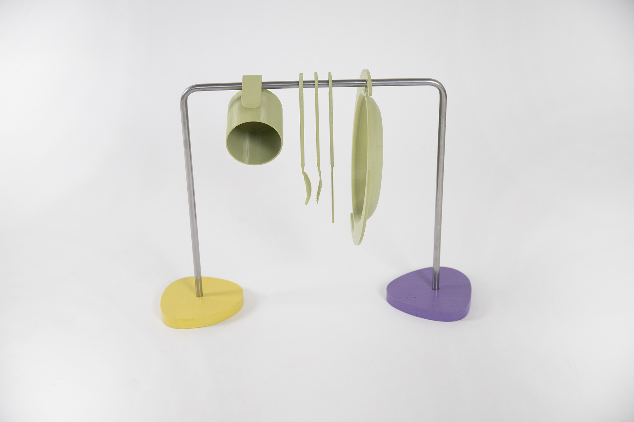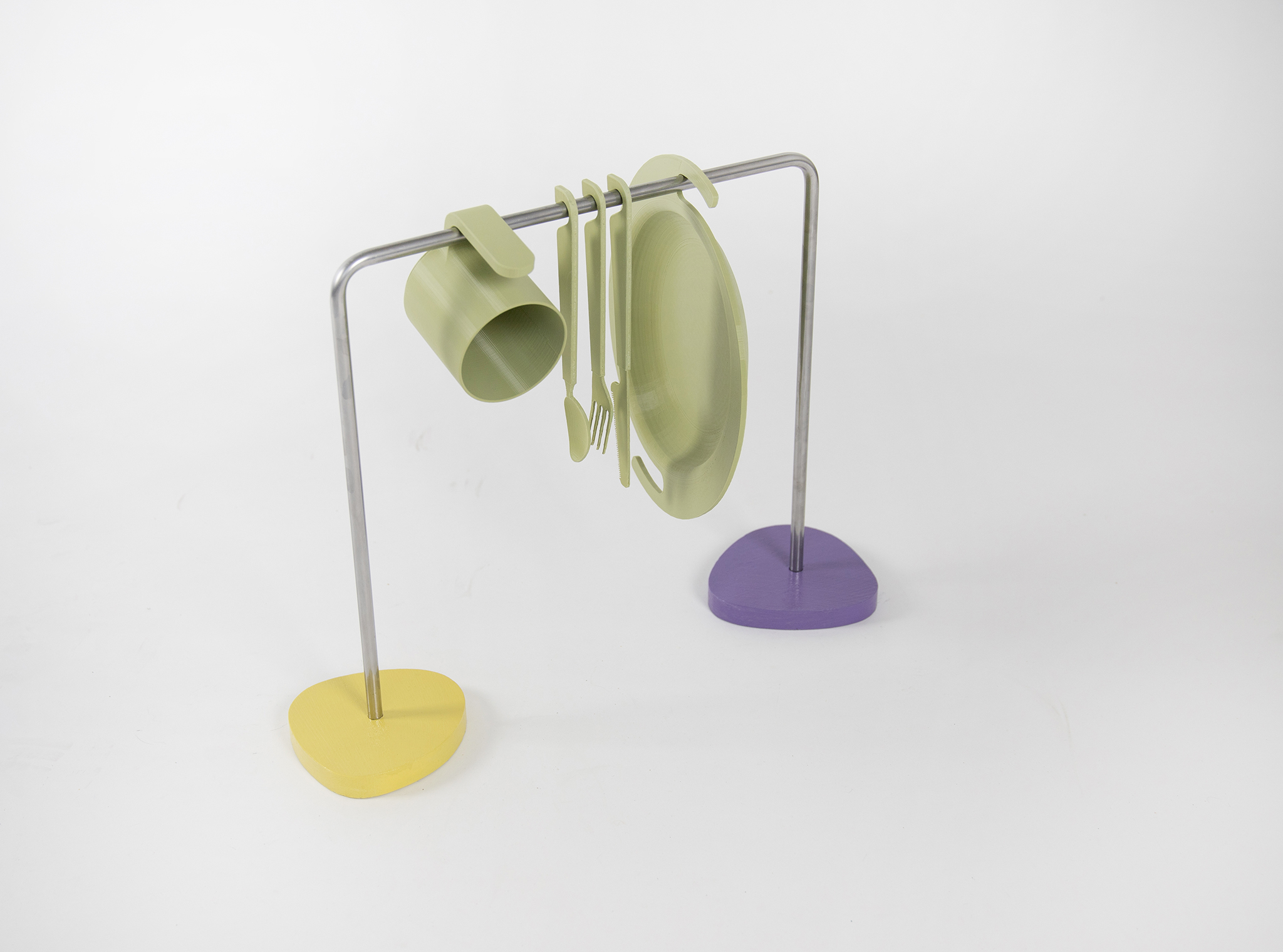 HOOKED is a playful dish set that offers a new way of interacting with our daily activities and chores. The set functions as any other dish set, however small adjustments within its form give it another functional aspect. All the set parts have a hook form integrated into them which allows the user to hang all pieces. The set changes the order of the dishwashing routine as once the dishes are dry, there is no reason to store them in an extra cabin or shelf. They can easily remain hanging until the next use, just as the pots and spatulas often hanging in our kitchen. The set is especially suitable for individuals looking for a stylish and EASY storage solution and for an easier dish-washing routine.