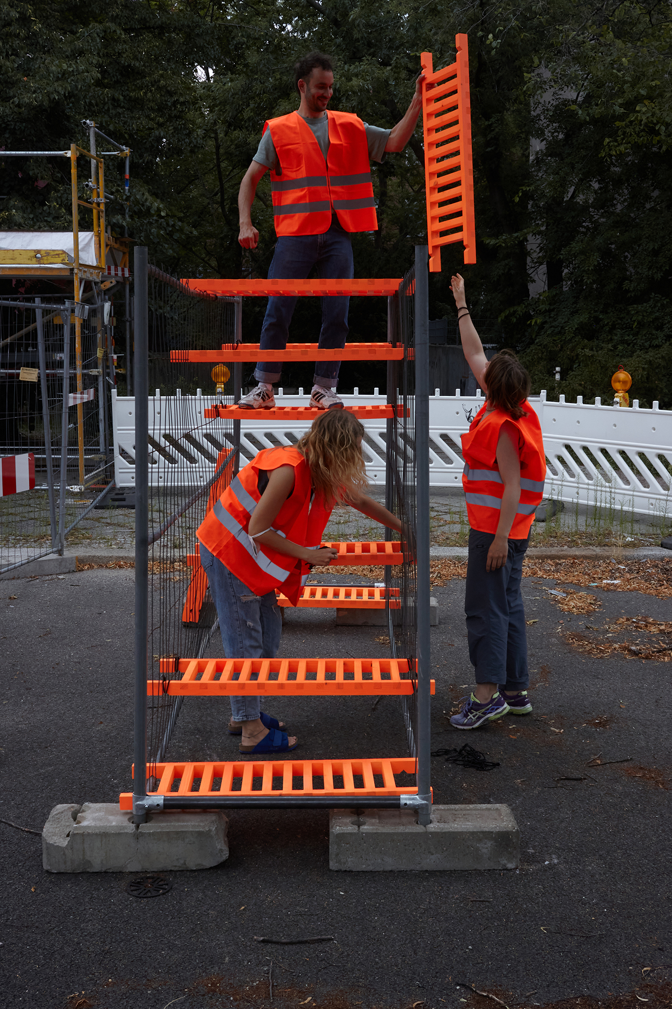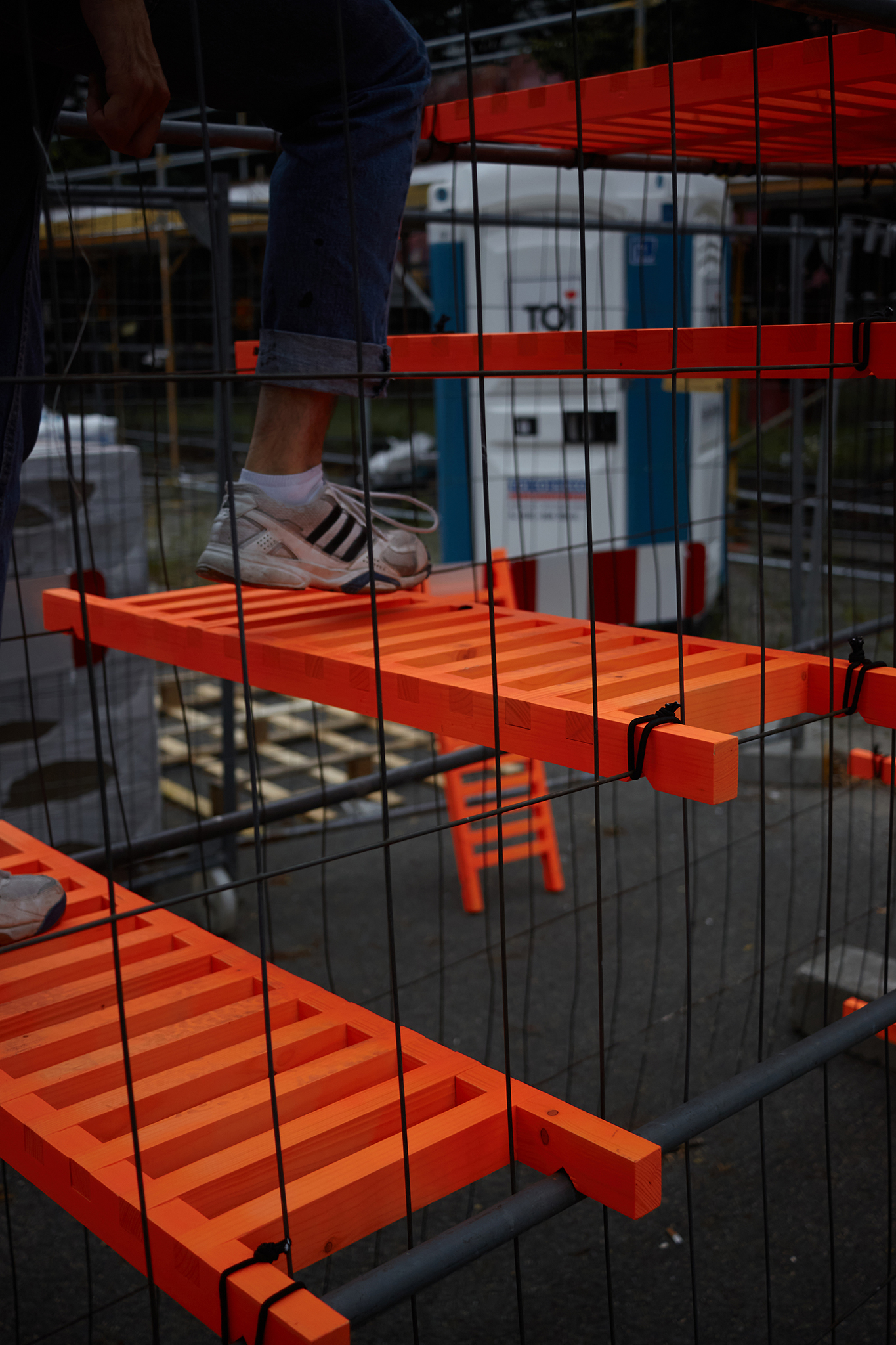 Inbetween explores the interstices of these questions and raises new ones. The project is intended to encourage people to look at this for themselves and to question who owns the city and what role its inhabitants play in it. It calls on people to open up free spaces and to question given orders. Structures are reused in a playful and unfamiliar way; symbols of exclusion and isolation become places of encounter and dwelling. Where neighbourhoods are torn apart and neighbours displaced, new paths, new staircases, balconies, terraces, roofs, tables, chairs are needed. Like the network of fences that separate us, we too need to come together like a net and shape our cities together in the way we find most livable.
