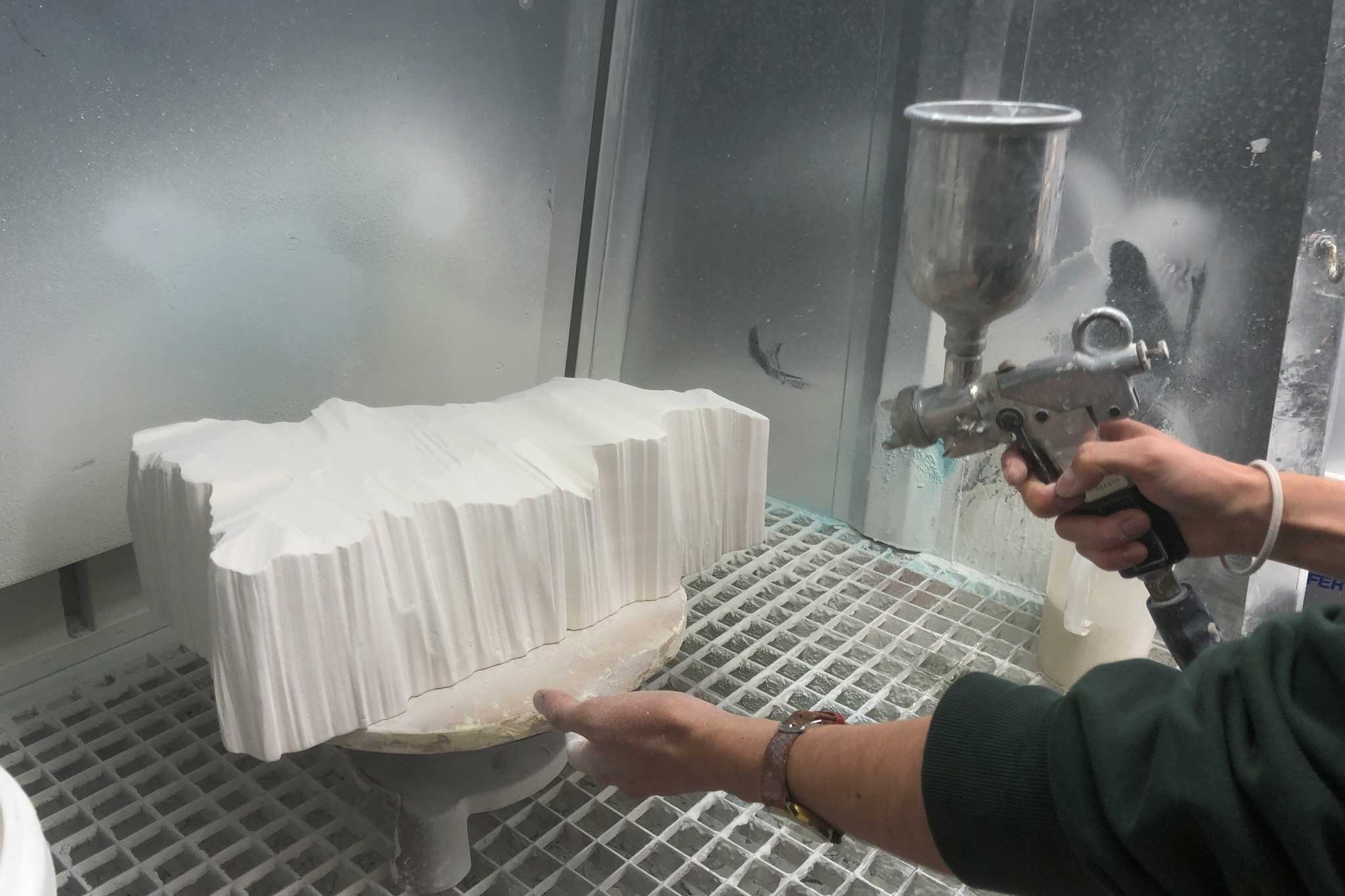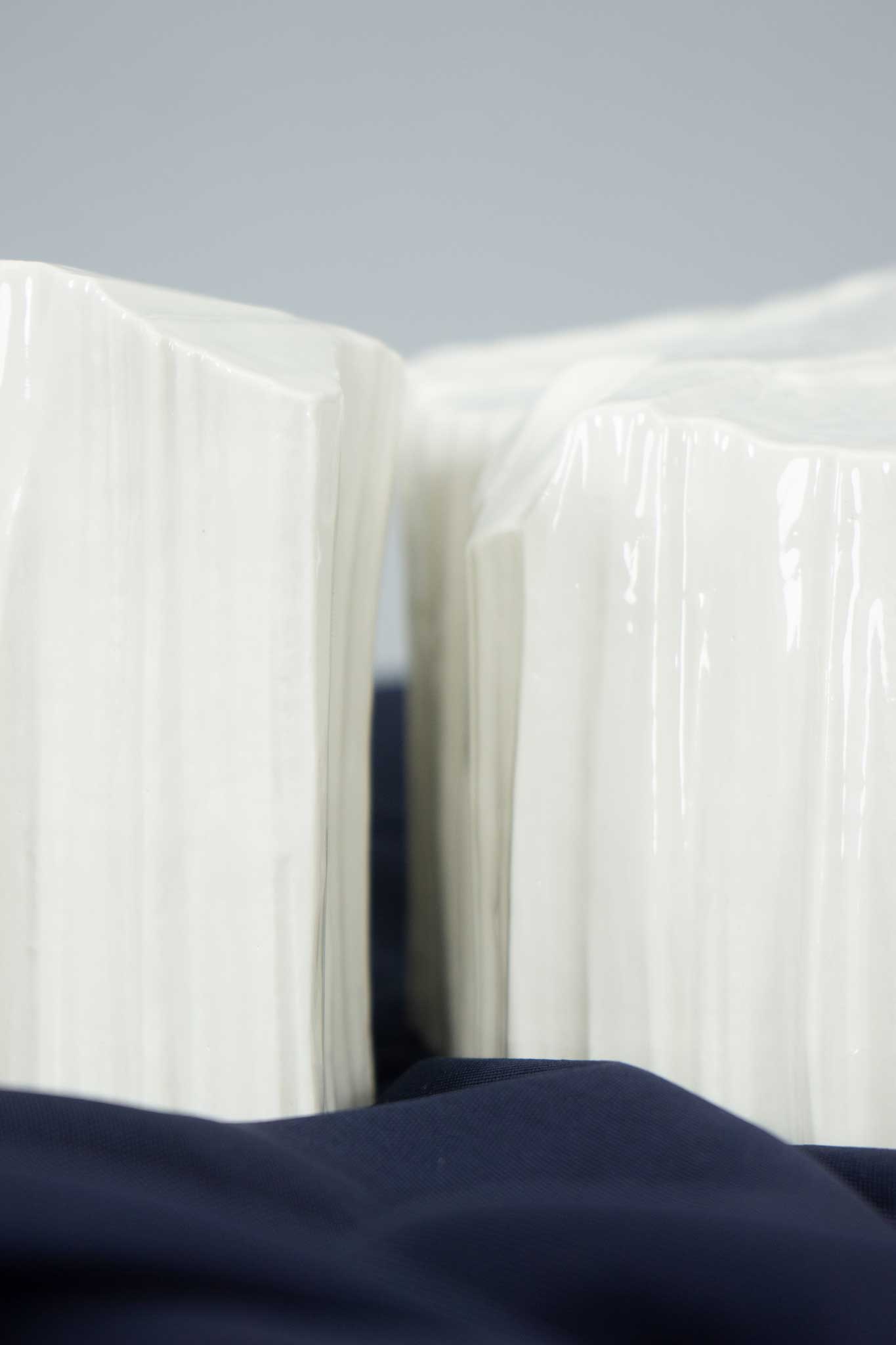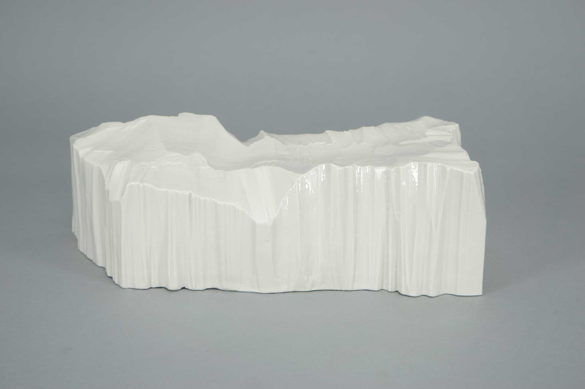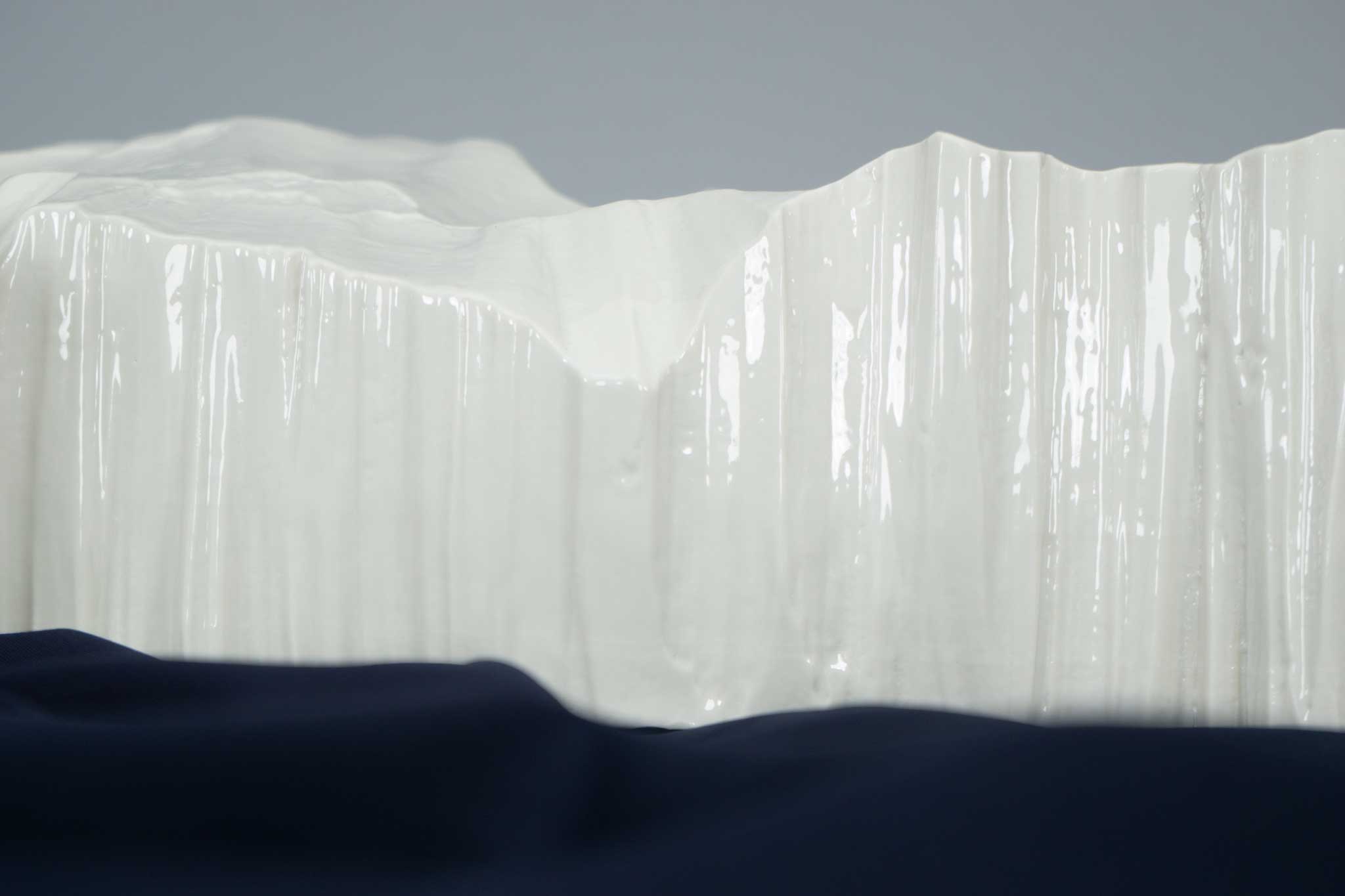 It Is Still Here is a new take on the role of porcelain objects as table decorations and conversation pieces as we know them from the 16th century onwards. The collection of four objects shows an abstract portrait of the ever-changing and melting Thwaites Glacier, frozen in time. Preserved in porcelain, a material similar to ice in its color, feeling of temperature and brittleness, but a lot more durable, so one can take the memorandum to the glacier into the comfort of their own home. Reminding us, that right now the glacier is still there.