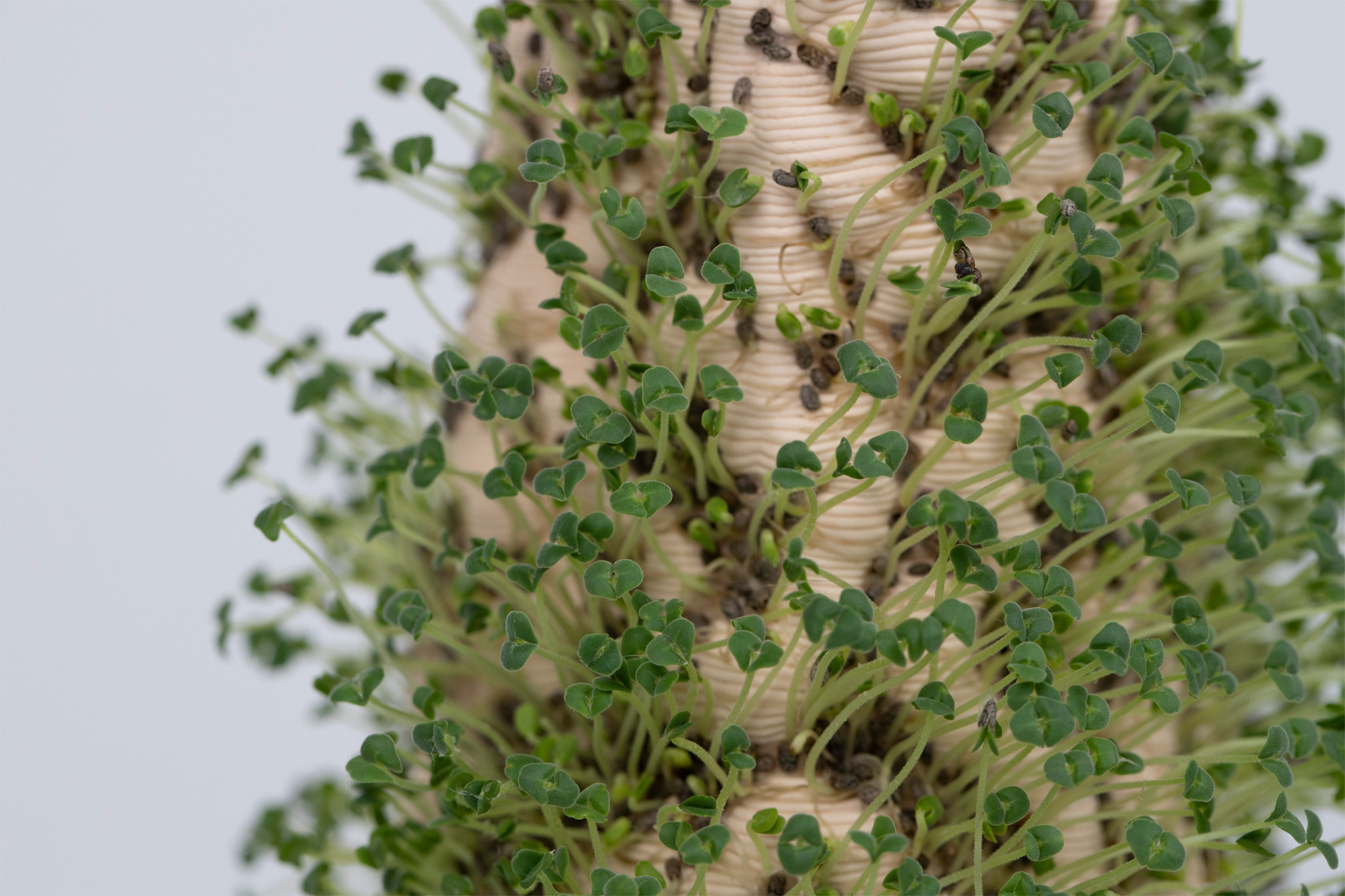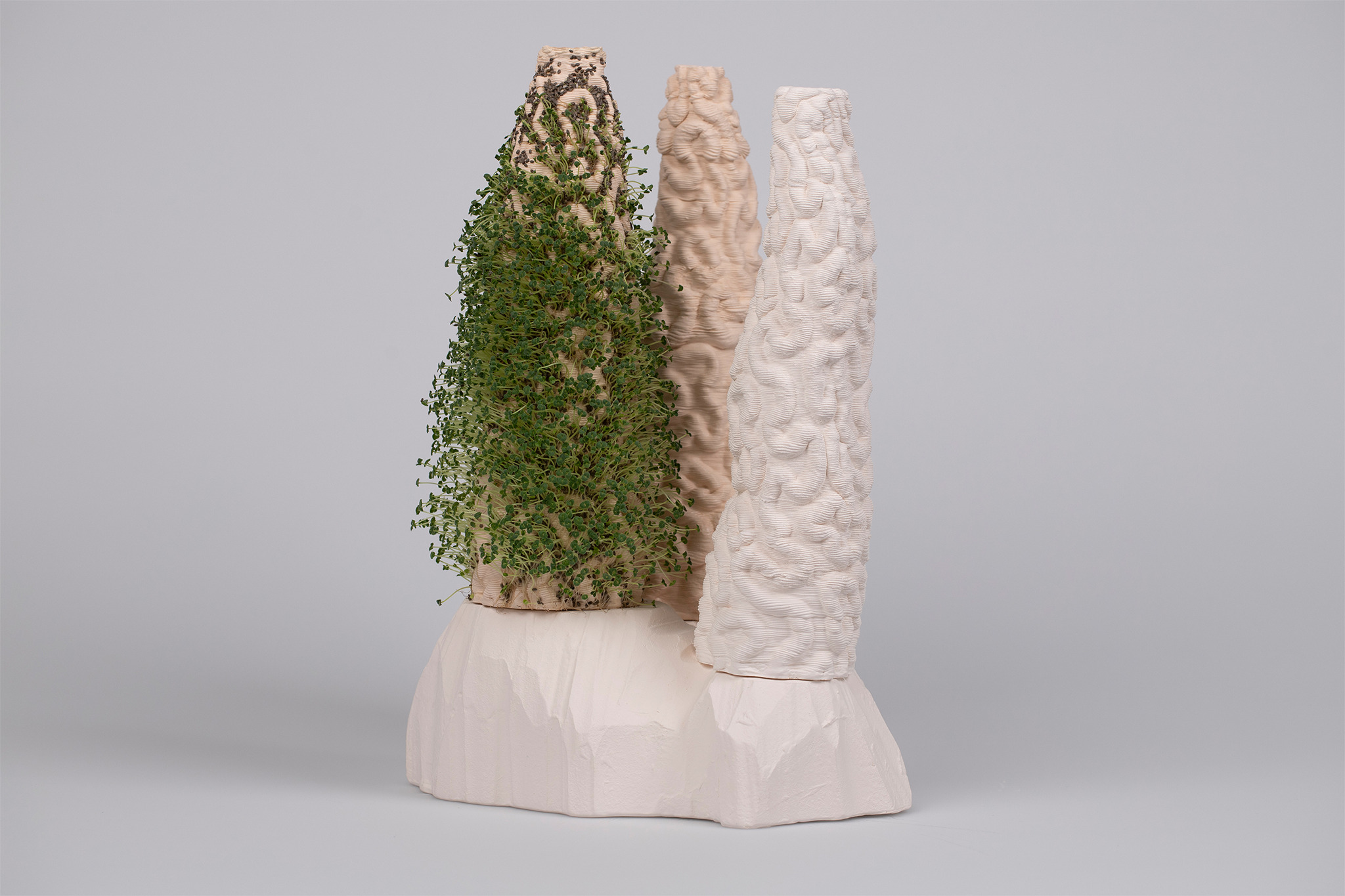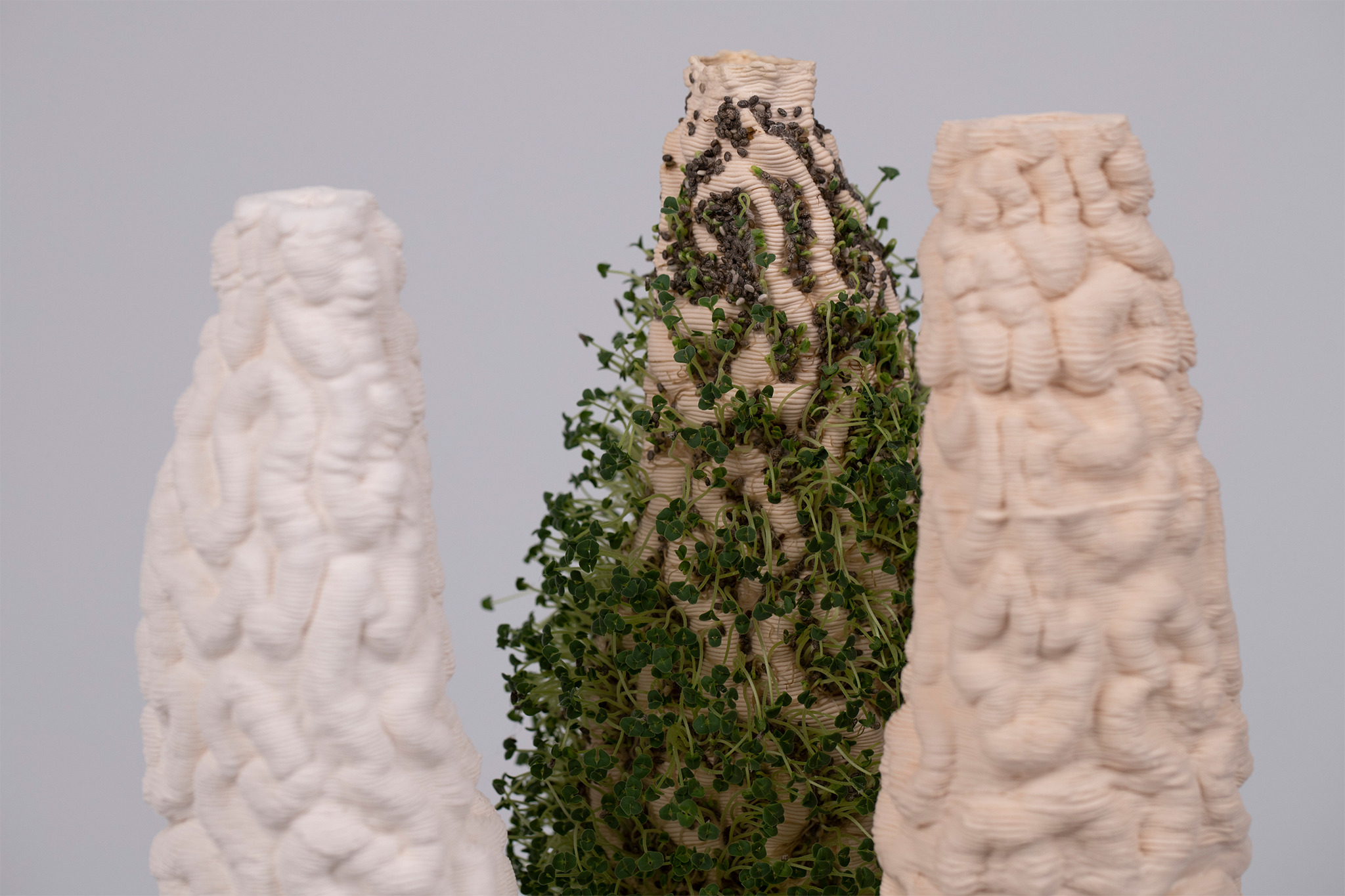But that only happens if we act. If we care. When I think about figurines, I think about kitsch and people having porcelain figures somewhere on their shelves, waiting for them to slowly dust away. KORAL is a more interactive approach to figurines. KORAL generates a relationship with the figurine, not just an emotional one but a relationship that depends on each other. You have to care about KORAL, to keep it alive. By underfiring the 3D-printed porcelain, it absorbs water and moisturizes the surface. To create a reciprocal relationship with the figure, I immediately thought of a living figure. Something special that deserves your attention. The 3D printed structure is the perfect base for planting on the surface. By absorbing water, the porcelain keeps them alive. But only if one cares about it. Feeding it with water and attention. This project is nowhere near a solution to coral bleaching around the world. But it brings corals back into our daily lives.