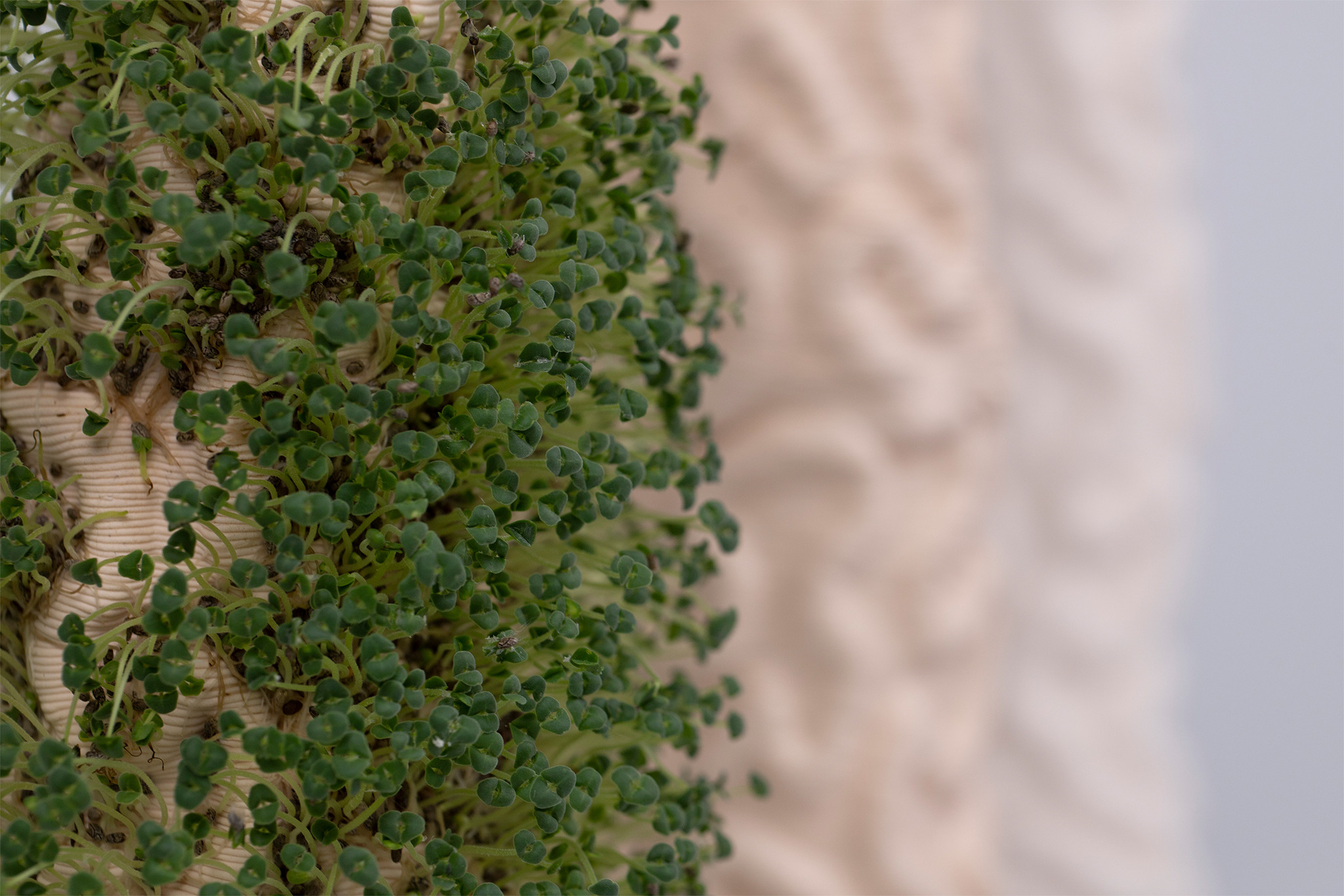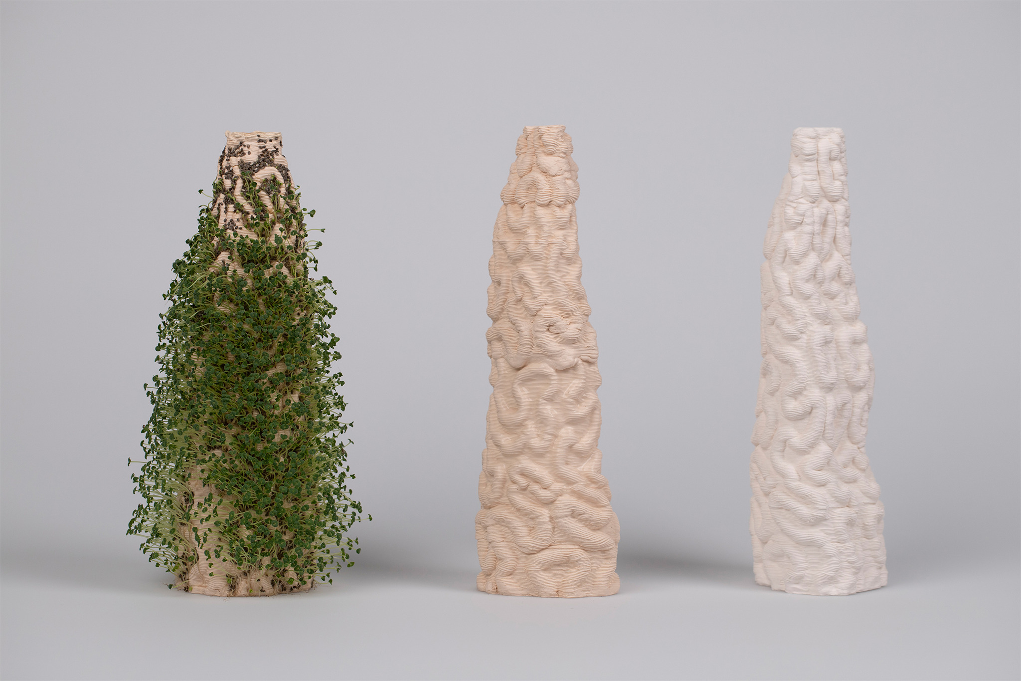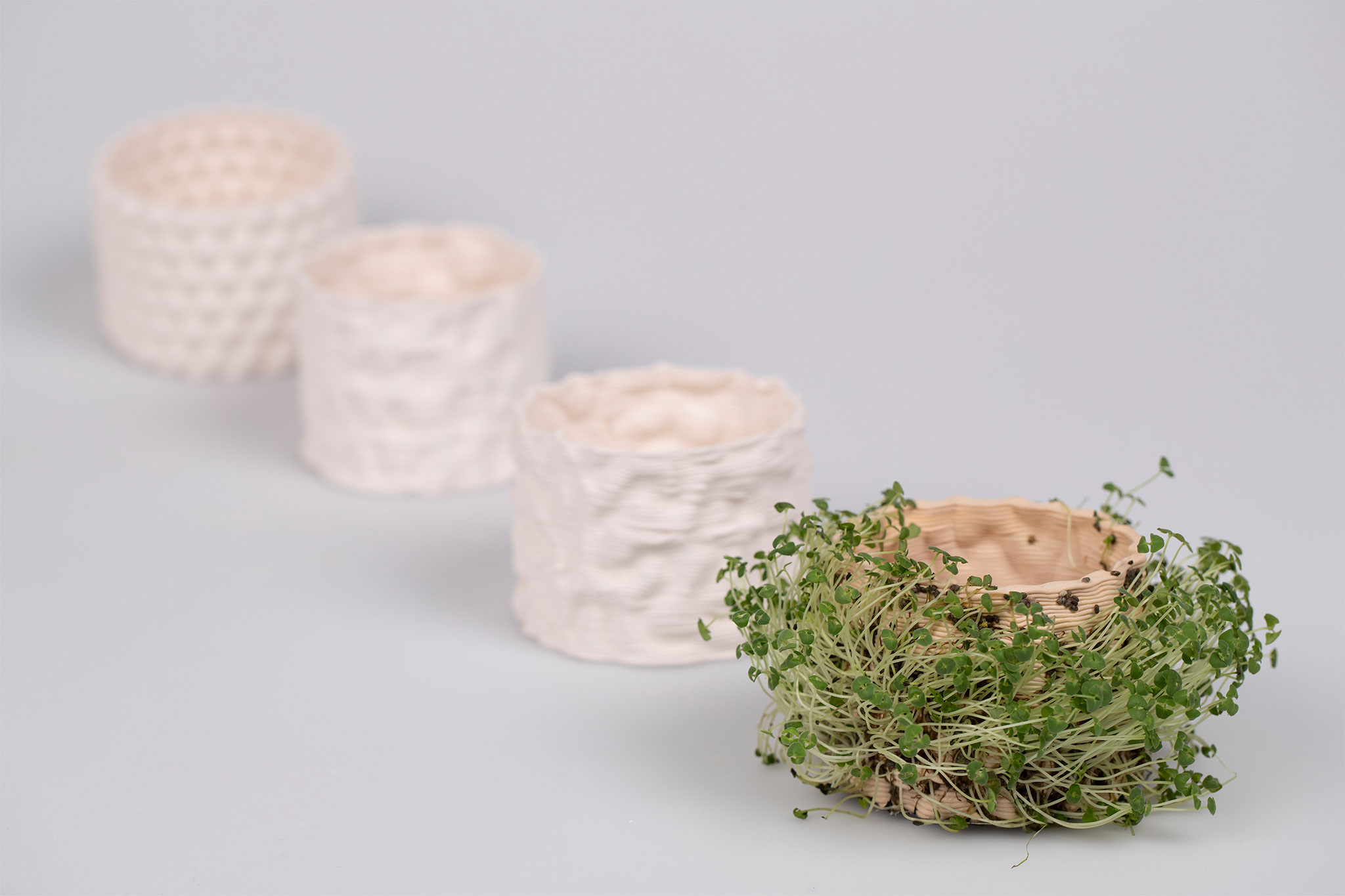 But that only happens if we act. If we care. When I think about figurines, I think about kitsch and people having porcelain figures somewhere on their shelves, waiting for them to slowly dust away. KORAL is a more interactive approach to figurines. KORAL generates a relationship with the figurine, not just an emotional one but a relationship that depends on each other. You have to care about KORAL, to keep it alive. By underfiring the 3D-printed porcelain, it absorbs water and moisturizes the surface. To create a reciprocal relationship with the figure, I immediately thought of a living figure. Something special that deserves your attention. The 3D printed structure is the perfect base for planting on the surface. By absorbing water, the porcelain keeps them alive. But only if one cares about it. Feeding it with water and attention. This project is nowhere near a solution to coral bleaching around the world. But it brings corals back into our daily lives.
