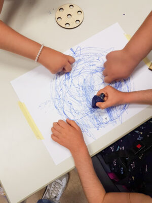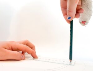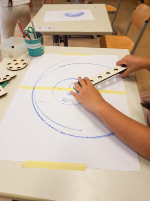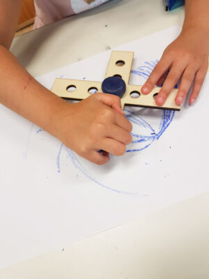Milo is a tool for children that allows first experiences with geometry at a young age. It encourages their creative exploration of shapes and colours without restricting their creative freedom. Because Milo has no right or wrong use, and can be handled differently by each child, new patterns and images can be created in addition to circles and right angles. Children often do not have the drive to draw a perfect circle. Rather, they want to experience and explore without being limited to one function. The children can now playfully expand their creative drawing with the wax crayons using a compass, ruler and rope.