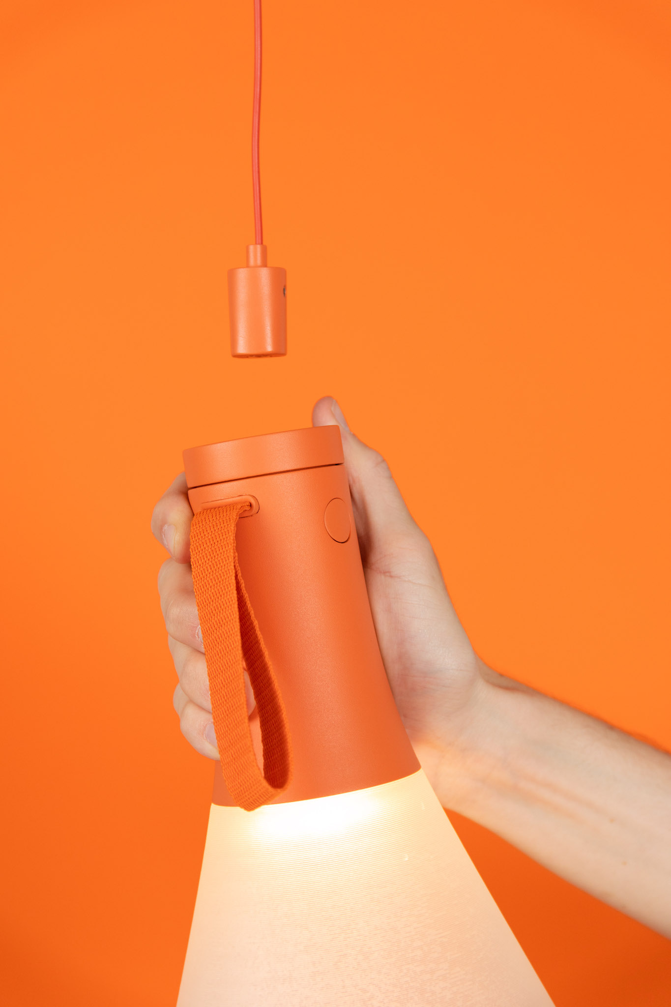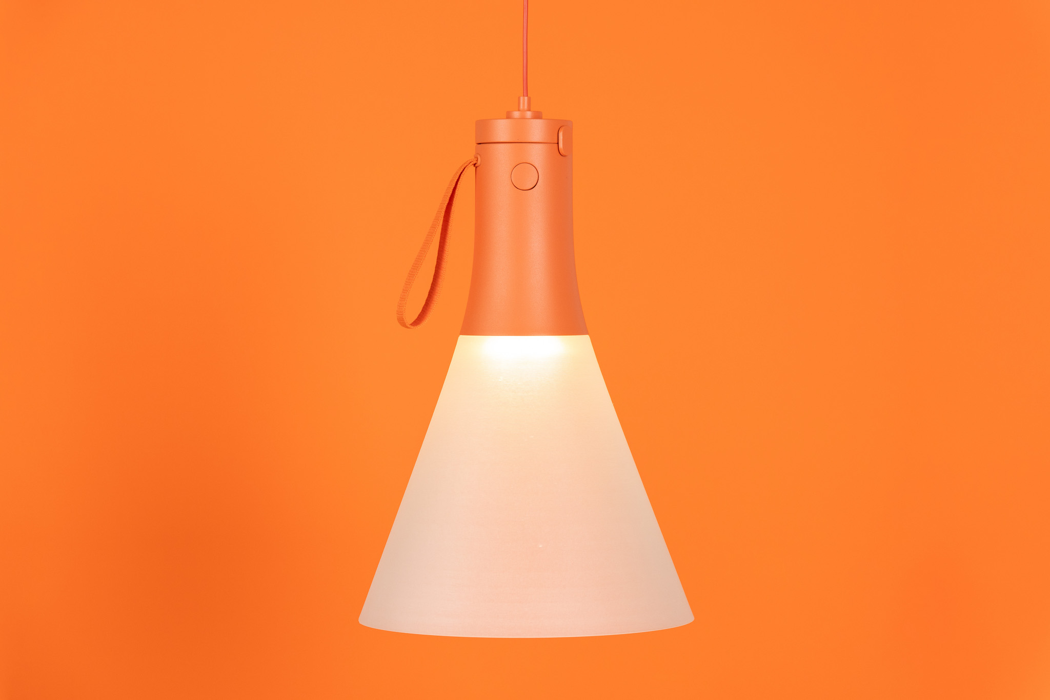 VESPERTINE combines the archetype of the familiar ceiling lamp with mobile lighting technology. Hanging from the ceiling as a pendant lamp, VESPERTINE charges the integrated batteries for mobile use. With a simple motion, the magnetic plug releases and VESPERTINE becomes a portable light source for activities beyond the daylight, curating lighting moods both indoors and outdoors.