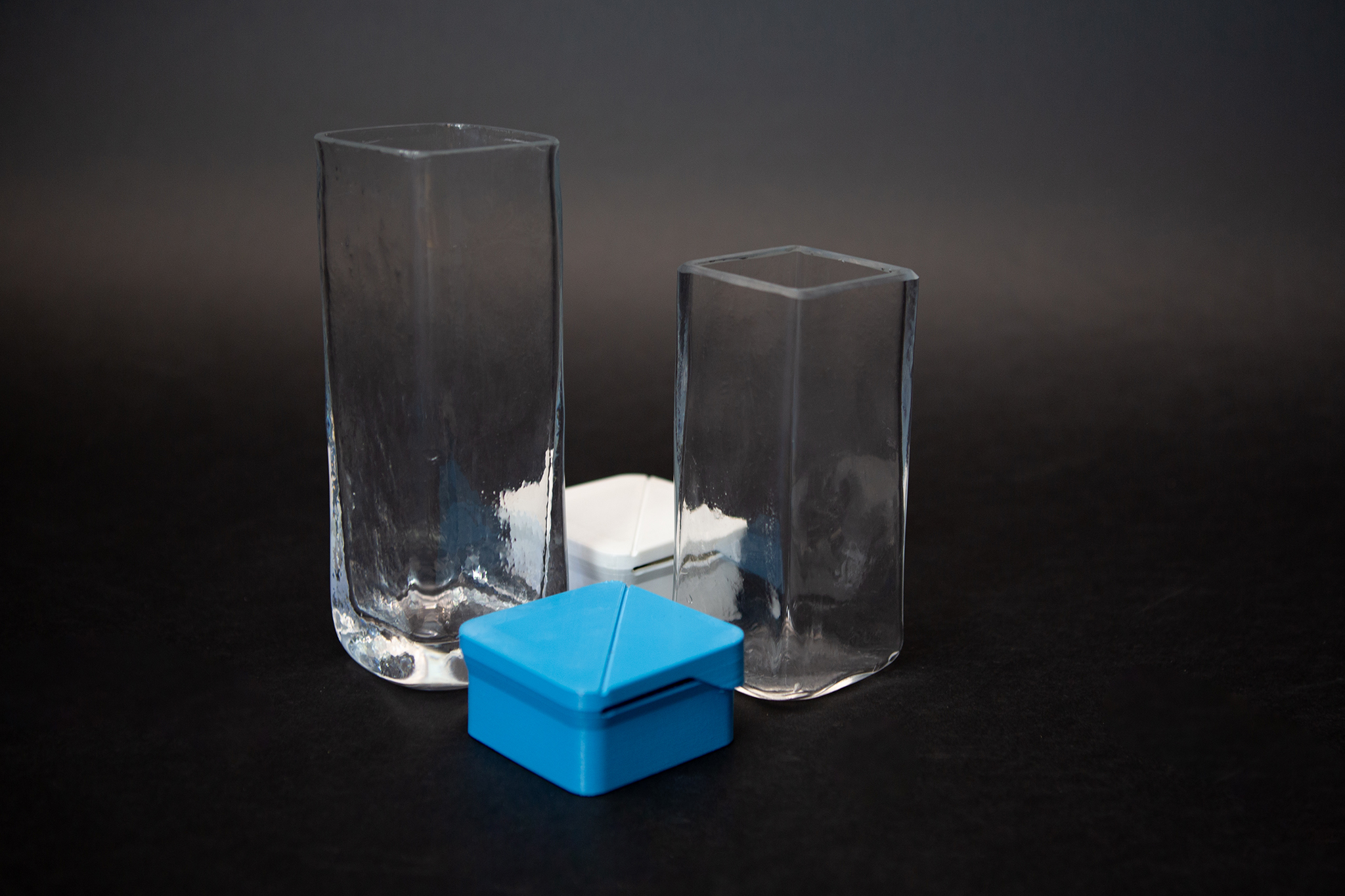 Our goal with CUBO was to design a 100 percent returnable alternative to beverage carton and glass bottles. CUBO is a reusable alternative with the lid firmly attached to the bottle itself. This guarantees that no waste is generated during its entire life cycle. Industrially, on the other hand, the lid can be easily removed for cleaning and filling. It combines the convenience of beverage cartons with the ecological materiality of existing deposit glass bottles. Due to the under-cut-free shape, industrial cleaning of the bottle can be carried out in a much more resource-friendly manner than with conventional glass bottles. The lid can be opened completely in half. Thus, any contents can be poured out comfortably. Food products such as viscous dairy products like yogurt can also be conveniently completely consumed due to the omission of undercuts. In addition, the glass form can be produced more easily, since it is completely open on the top. Another problem with the handling of glass bottles is the lip of the spout. When pouring slowly, the contents usually drip down the neck of the bottle. To protect the glass from breaking, it must be strongly rounded. However, in our design, the edge of the glass is protected by the plastic cap all around, so we can use a sharp edge. Thus, CUBO represents a completely ecological alternative to conventional beverage containers.