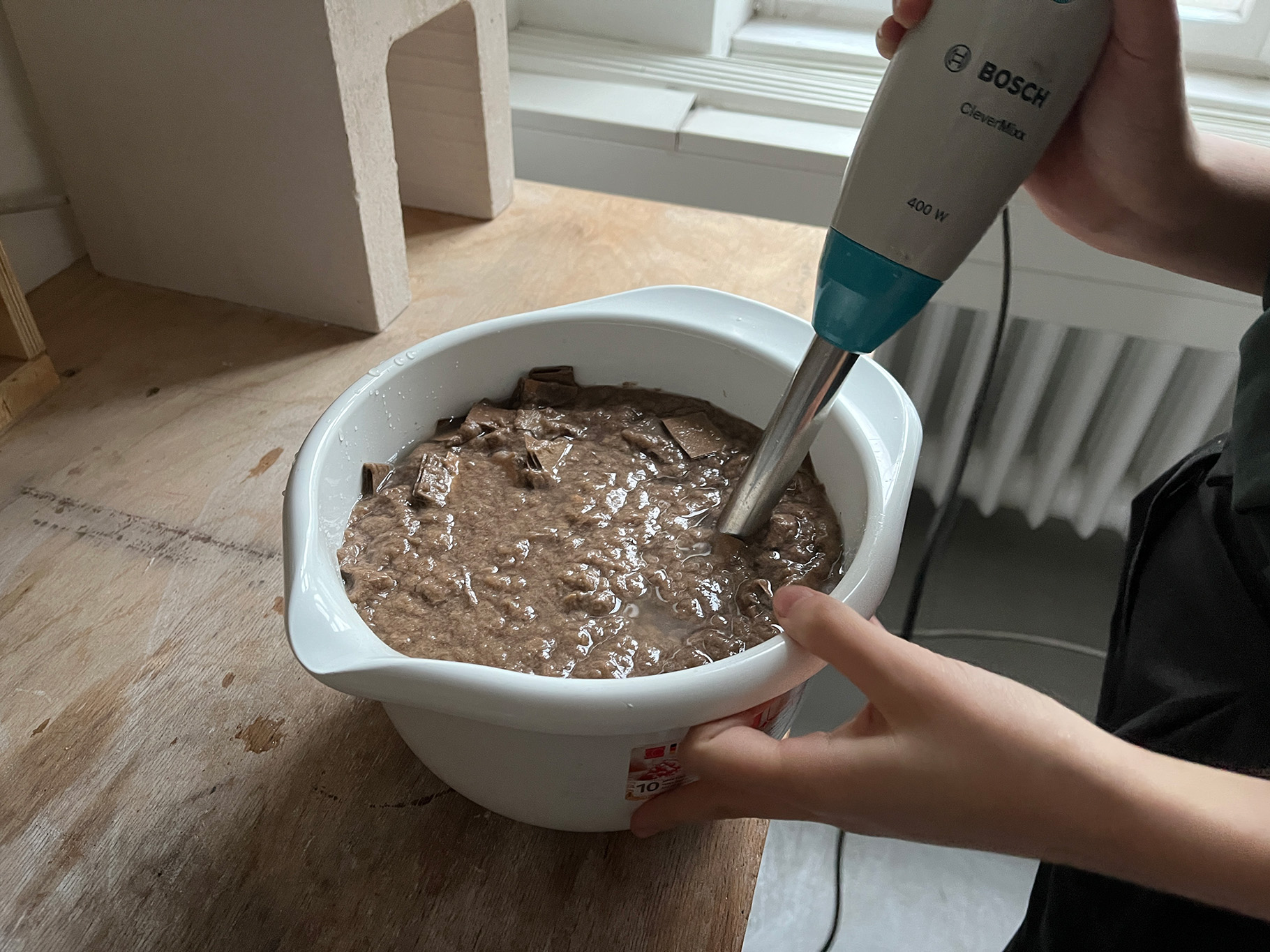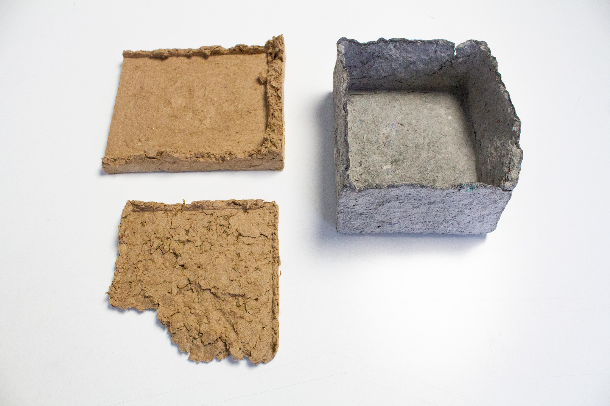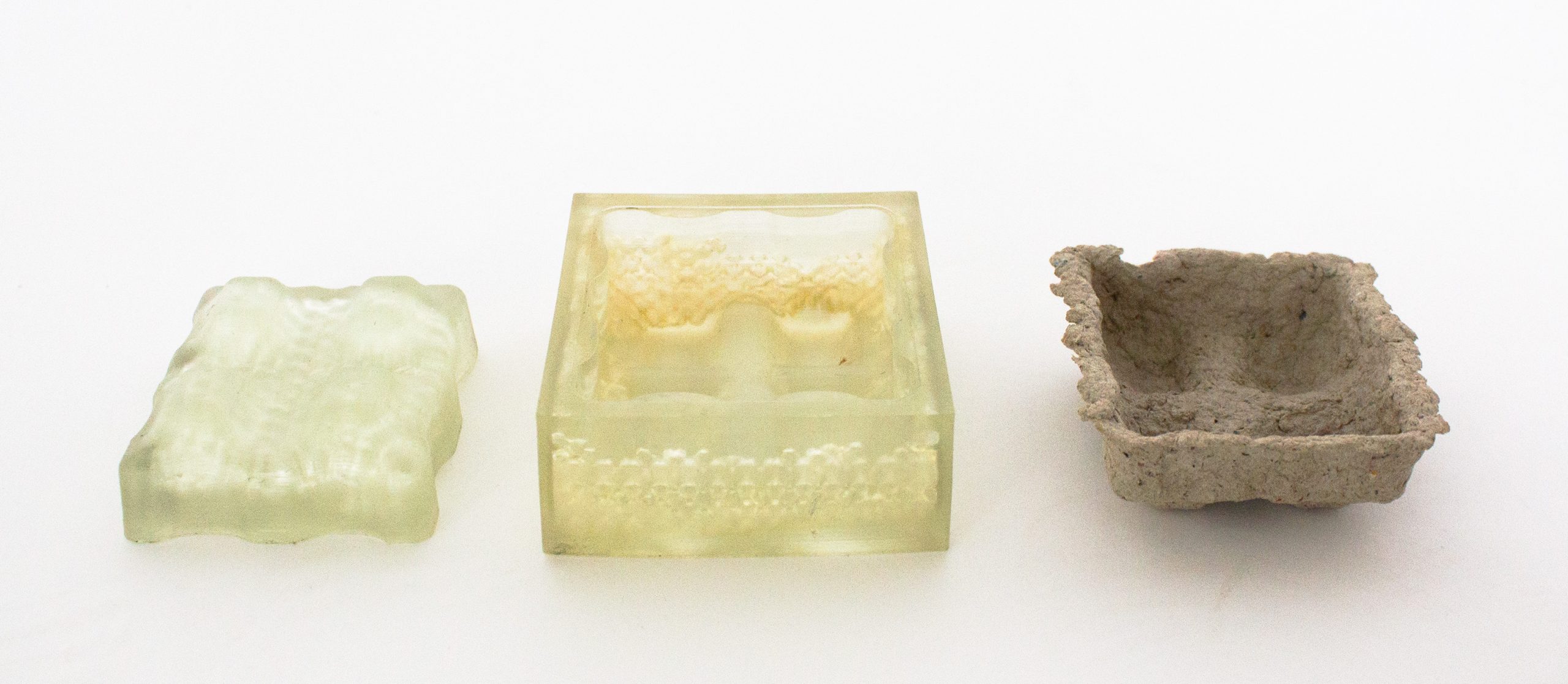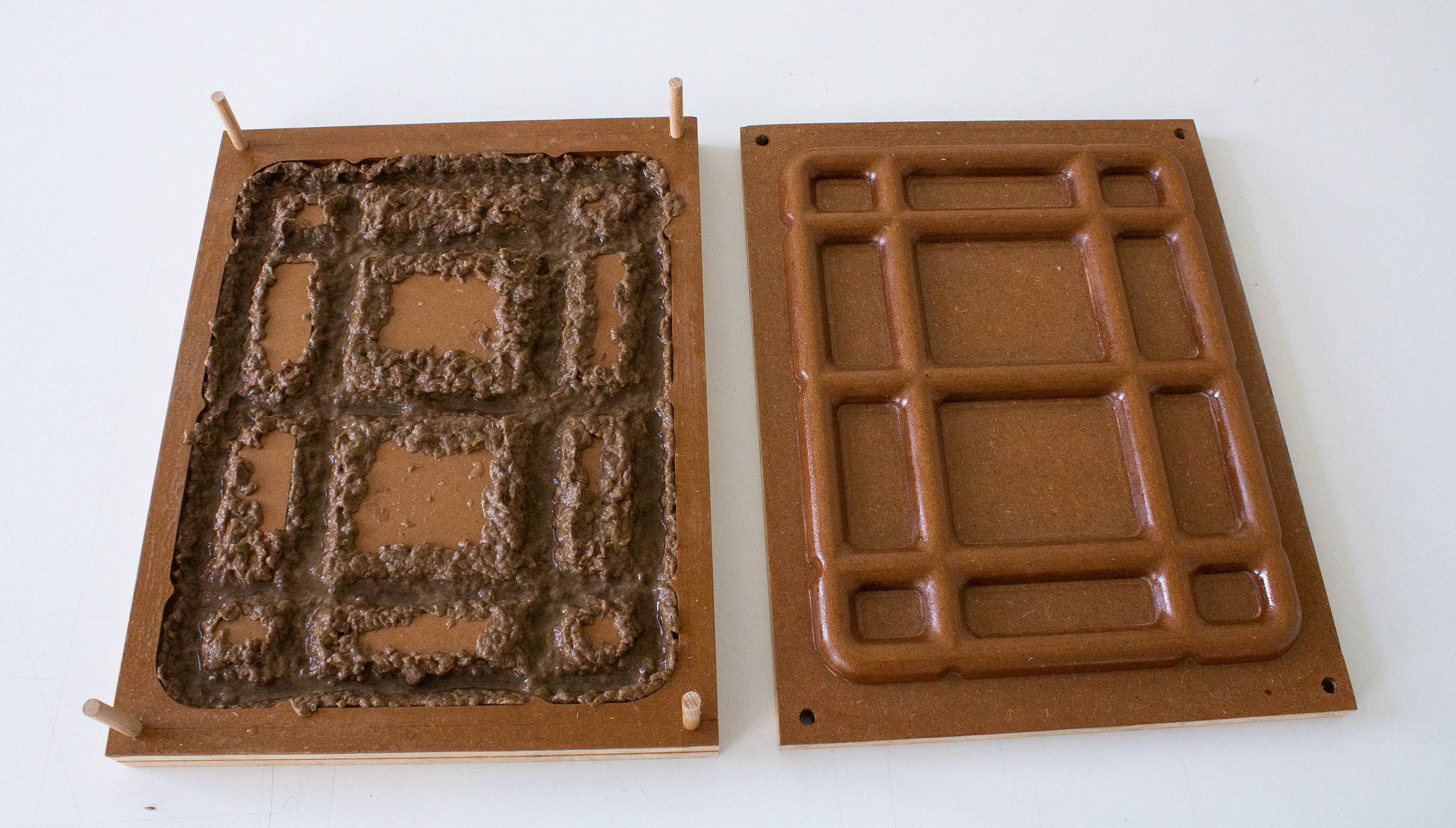 For the production of the two elements, we have designed two corresponding molds (one negative and one positive) that correspond to the actual industrial pulp molding process. For this process, we use a mixture of paper pulp, recycled cardboard and water. When preparing the mixture, we add salt to prevent mold formation when in contact with moisture.