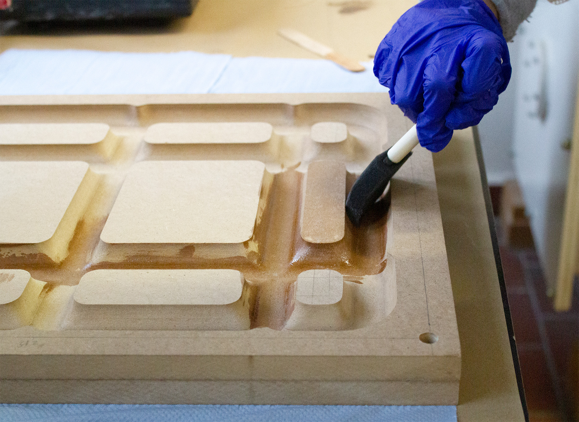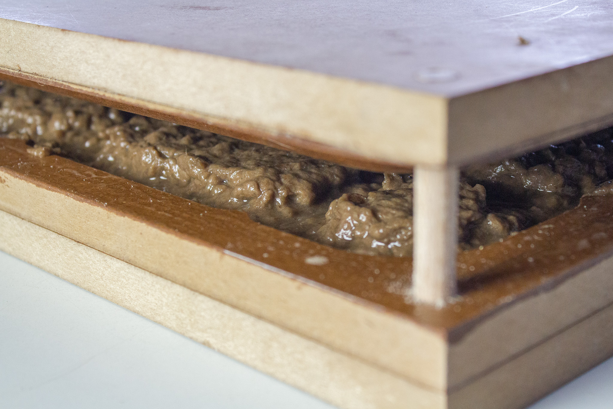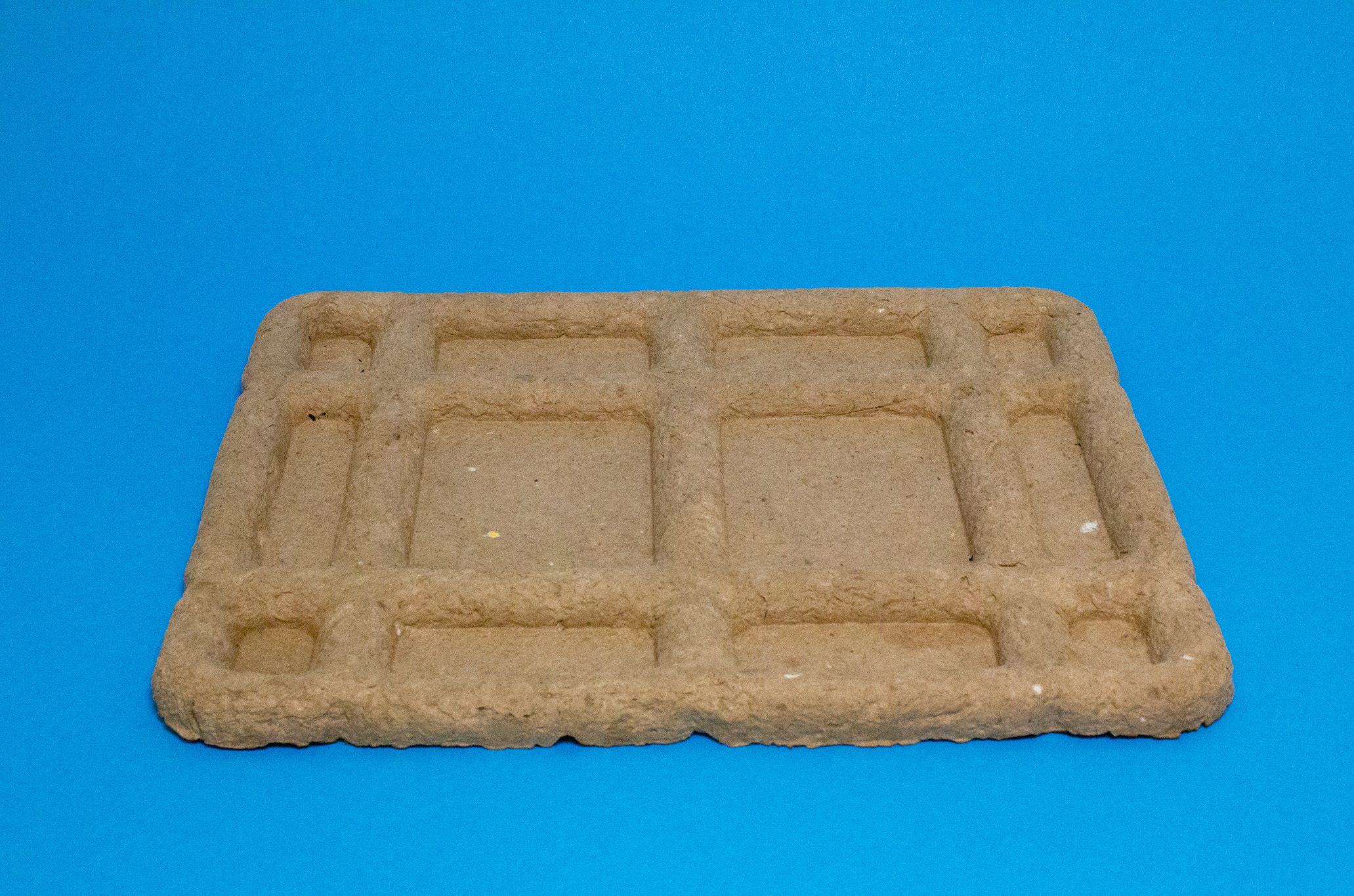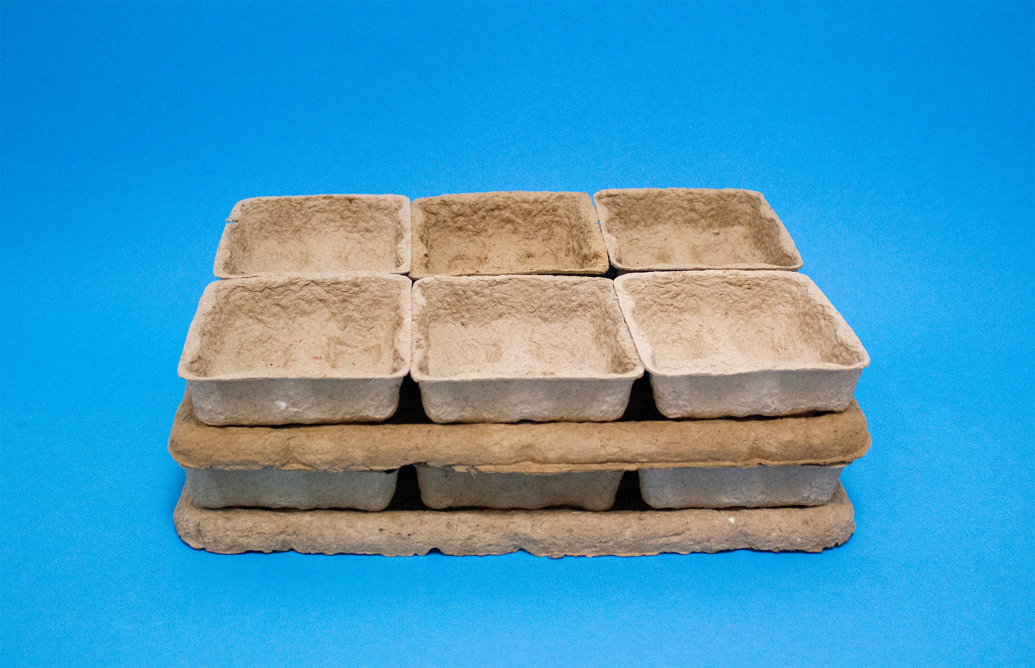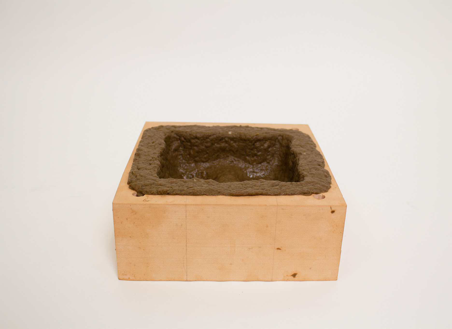 For the production of the two elements, we have designed two corresponding molds (one negative and one positive) that correspond to the actual industrial pulp molding process. For this process, we use a mixture of paper pulp, recycled cardboard and water. When preparing the mixture, we add salt to prevent mold formation when in contact with moisture.
