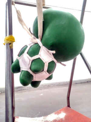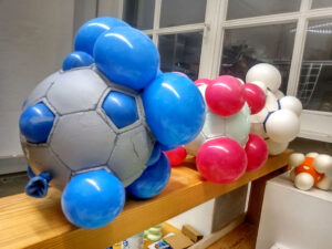 To find a new shape in the original geometry, I cut parts from the balls and filled them with balloons. Afterwards the filling with air was tested to the maximum. In further experiments of this kind, I was able to control the coincidence so consciously by creating patterns, some symmetrical, some uneven, through cutouts in the balls.