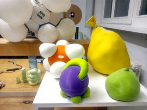 For this purpose, the balloons were filled with flour – like anti-stress balls. The elastic surface tension of the latex creates the additional potential of further deformation and change in the volumes exiting the holes. The results are flat, platy, long or rounded shapes due to a different arrangement of the holes in the shell and the malleability of the flour-filled balloons.