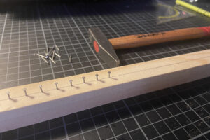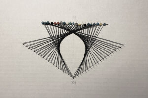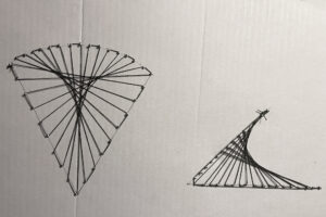 Bei STRINGS handelt es sich um eine experimentelle Erkundung von geometrischen Formen, wie dem Würfel, der Kugel und dem Tetraeder in Verbindung mit gespannten Fäden. Diese drei Formen dienen als Grundgerüst für die darin gespannten Fäden. Besonders interessant ist dabei, dass mithilfe von mehreren eng aneinander gespannten Fäden unterschiedliche kurvenartige Flächen entstehen. So wird aus etwas vermeintlich Geradem, Inflexiblem etwas Organisches und Bewegtes. Die Form des Rahmens, in dem die Fäden gespannt sind, beeinflusst die Art der entstehenden Kurven. Die Fäden durchdringen sich an einigen Stellen und bilden Verwebungen. Diese Verdichtung der Fläche bewirkt, dass die entsprechende Stelle stabiler und undurchsichtiger ist. Das größte Modell, das Tetraeder, spielt außerdem noch mit dem Thema Farbe: Blaue, gelbe und rote Fäden sind gespannt und durchdringen sich zur Mitte hin. Es entstehen Farbmischungen und Moires.