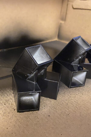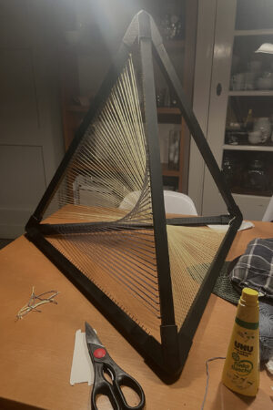 STRINGS is an experimental exploration of geometric shapes, such as the cube, the sphere and the tetrahedron in combination with tensioned threads. These three shapes serve as the basic framework for the threads tensioned in them. It is particularly interesting that different curved surfaces are created with the help of several tightly tensioned threads. In this way, something supposedly straight, inflexible becomes something organic and moving. The shape of the frame in which the threads are stretched influences the type of curves that arise. The threads penetrate each other in some places and form weaves. This compaction of the surface causes the corresponding area to be more stable and opaque. The largest model, the tetrahedron, also plays with the theme of colour: blue, yellow and red threads are stretched and penetrate each other towards the middle. Colour mixes and moires are created.