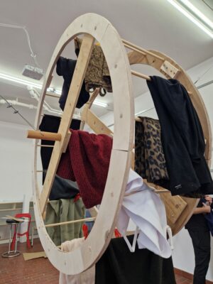 My very first notion was wanting to find a way to store clothes that didn’t require folding them. Whether it is hanging, rolling or any other innovative way- I knew I didn’t want to go for the a archityp. The model that started the whole process was born during team work. We constructed a wheel on which you can hang your clothes; with hanger, clothespins or just as it is. From then on, the Idea kept evolving, whist keeping the round shape and the spinning factor. Eventually the wheel-closet became a simple round compartment, with no shelves, no bars and no drawers.