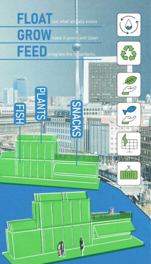 The project deals with new cultivation methods in an urban context. Like many other cities, Berlin‘s waterways were highly used in the past. That relationship however has decreased with time. The project offers a modern review of tho- se relationships as an answer to existing problems most cities face nowadays! Urban Aquaponics uses the already existing aquaponics culture and places it in the urban waters of Berlin. The project‘s main focuses are the connections with local inhabitants, the relationship to the existing ecosystem, and the totality of the circular farming and water system.