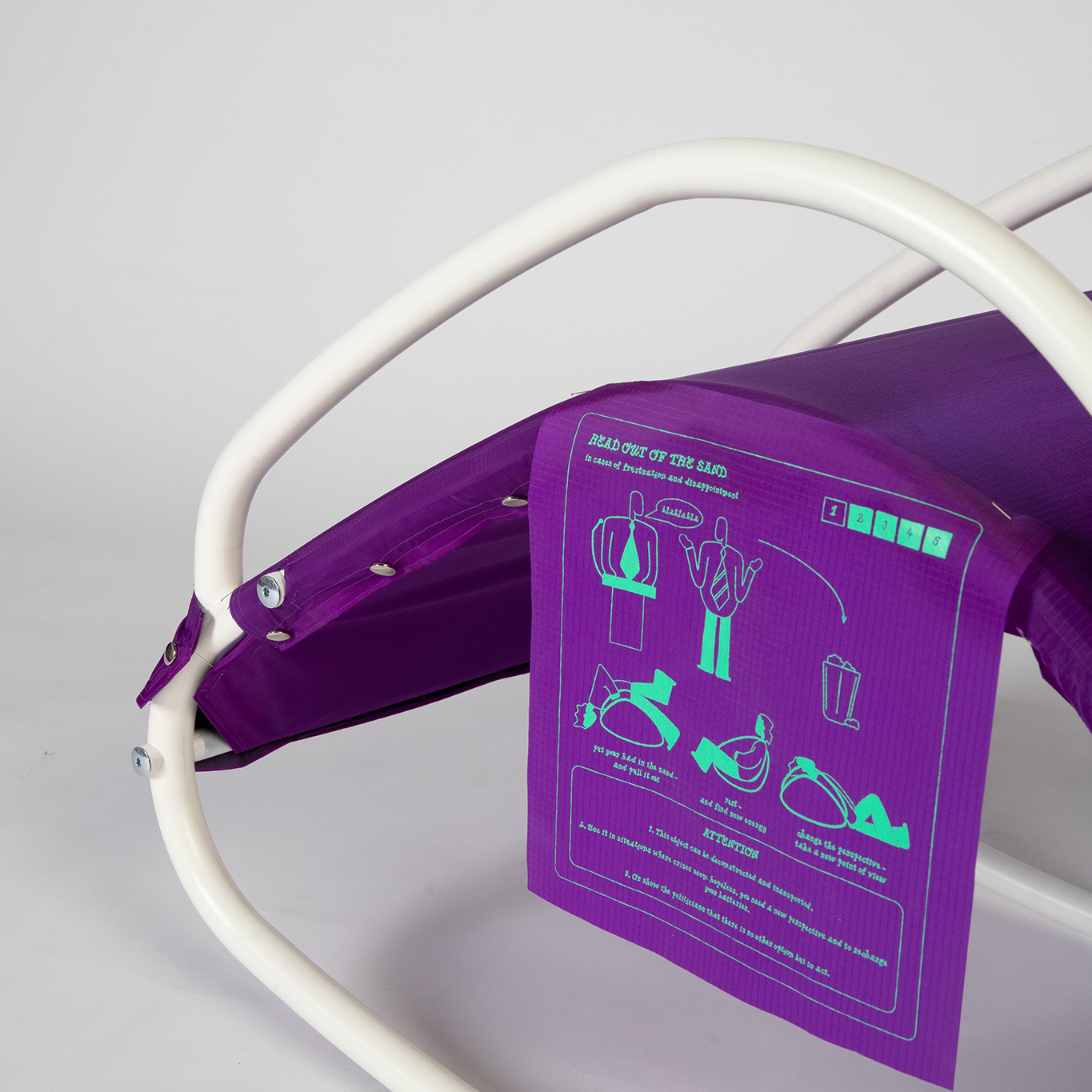 Die Objekte der Serie CALM IN CRISIS kommunizieren auf verschiedene Art und Weise Szenarien von Klimaaktivismen. In unterschiedlichen Kontexten können die Objekte als Erholungstools, in einer Klimademonstration oder zur Entwicklung von neuen Formen des Protests genutzt werden. In fünf verschiedenen Objekten werden Situationen von Klima Aktivismus visualisiert und erfahrbar gemacht. Die einzelnen Objekte vermitteln dabei verschiedene Gefühle, die im Bezug zur Klimakrise empfunden werden können.