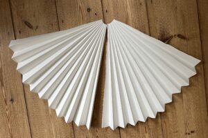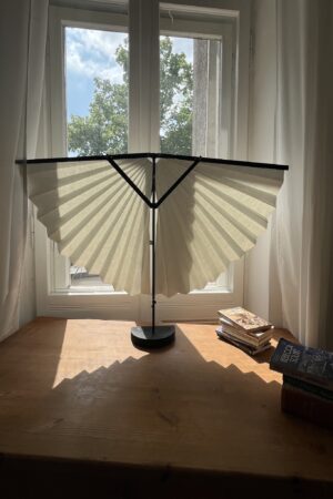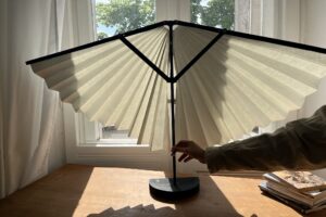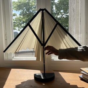 Der Schirm nutzt ein traditionelles Flaschenzugsystem zum Ausfahren der Flügel und ist mechanisch von einer Fadenpuppe, einem Regenschirm und einem Ventilator inspiriert. Die Symmetrie und Harmonie seiner Form strahlt ein Gefühl der Ruhe aus und sein radiales Design ist eine schöne Variante traditioneller Faltenvorhänge. Die Jalousien können auf einem Schreibtisch stehend verwendet werden, um direktes Licht zu blockieren oder ein Gefühl von Privatsphäre zu schaffen. Alternativ können sie als Vorhänge aufgehängt und bei Bedarf geöffnet werden. Nach dem Experimentieren mit vielen Materialien streut Papier das Licht am besten und verleiht dem Objekt eine filigrane Qualität. Die Laternen von Isamu Noguchi waren eine große Inspiration für die Materialien.