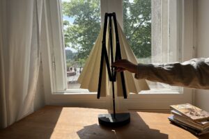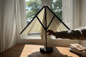 The shade utilizes a traditional pulley system to extend the wings and takes mechanical inspiration from a string puppet, umbrella and a fan. The symmetry and harmony in its form exudes a sense of calm and its radial design is a beautiful twist on traditional pleated curtains. The blinds can be utilized standing on a desk to block direct light or to add a sense of privacy. Alternatively, it can be hung as curtains and opened when needed. After experimenting with many materials, paper diffuses light the best and adds to the delicate quality to the object. Isamu Noguchi’s lanterns were a big inspiration for materials.