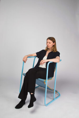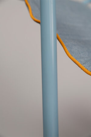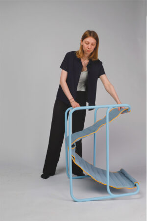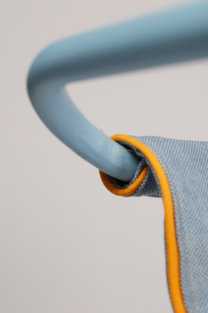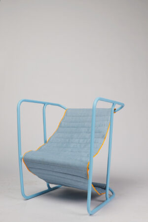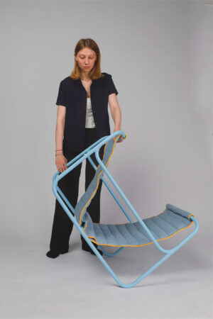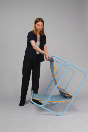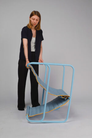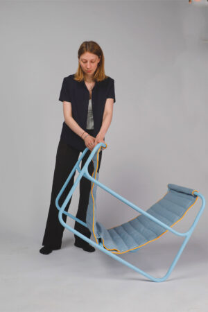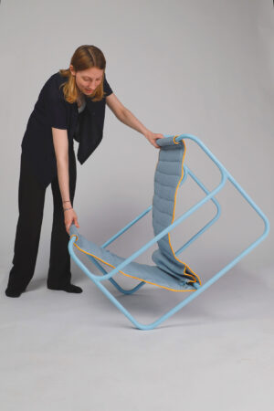 Especially in small flats, it is not always possible to accommodate an armchair and several chairs. Guests have to try to make themselves comfortable on chairs or sit down on a sofa or armchair to eat. Blu combines a chair and a lounge chair in one object. By turning it over, it changes its seat height without resorting to adjustment mechanisms. The hanging upholstery is stretched into shape by sitting in it. The tab on the back acts as a stopper to ensure the optimum seat height and prevents the fabric from sliding too far. This prevents the cushion from sagging and supports the body.