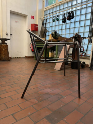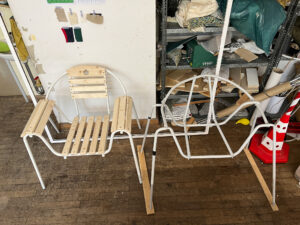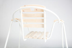 The chair is made from bent steel tubes which are welded together. The seating, the armrests and the backrest consist of wood planks which are fixed to the steel tubes with blind rivets. 3D printed plastic pegs seal the open ends of the tubes to prevent rain from getting inside. The white colour, the natural wood and the flower shape in the backrest give a summery and light feeling to the chair.