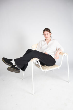 Der Stuhl besteht aus gebogenen Stahlrohren, die miteinander verschweißt sind. Die Sitzfläche, die Armlehnen und die Rückenlehne bilden Holzbretter, die mit Blindnieten am Stahlrohr befestigt sind. 3D-gedruckte Kunststoffstöpsel verschließen die offenen Enden der Rohre, um das Eindringen von Regen zu verhindern. Die weiße Farbe, das natürliche Holz und die Blumenform in der Rückenlehne verleihen dem Stuhl eine sommerliche und leichte Atmosphäre.