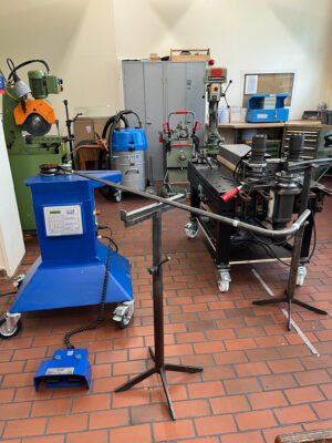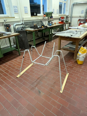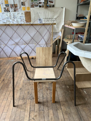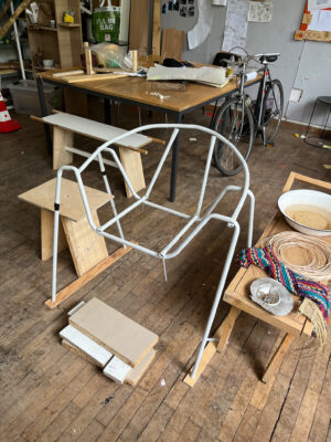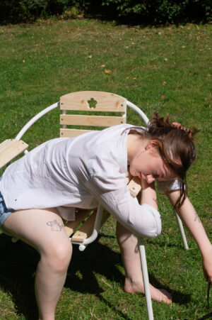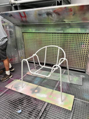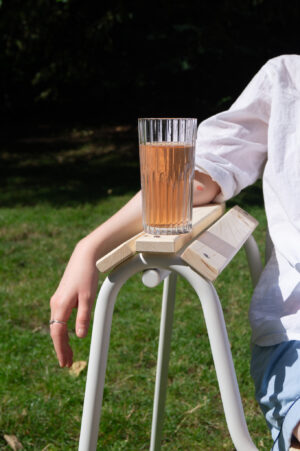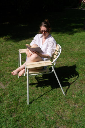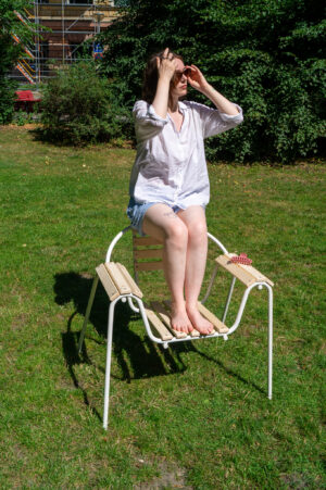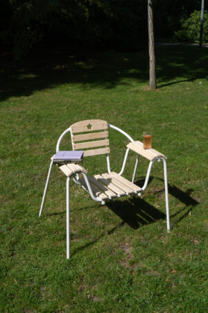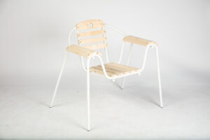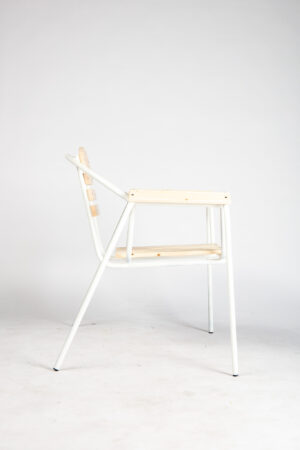 The chair is made from bent steel tubes which are welded together. The seating, the armrests and the backrest consist of wood planks which are fixed to the steel tubes with blind rivets. 3D printed plastic pegs seal the open ends of the tubes to prevent rain from getting inside. The white colour, the natural wood and the flower shape in the backrest give a summery and light feeling to the chair.