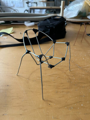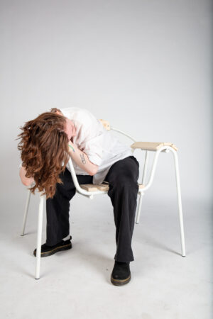 Der Stuhl besteht aus gebogenen Stahlrohren, die miteinander verschweißt sind. Die Sitzfläche, die Armlehnen und die Rückenlehne bilden Holzbretter, die mit Blindnieten am Stahlrohr befestigt sind. 3D-gedruckte Kunststoffstöpsel verschließen die offenen Enden der Rohre, um das Eindringen von Regen zu verhindern. Die weiße Farbe, das natürliche Holz und die Blumenform in der Rückenlehne verleihen dem Stuhl eine sommerliche und leichte Atmosphäre.