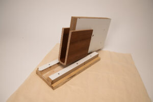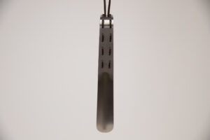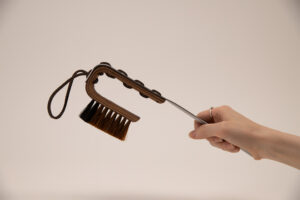 The leather strap acts both as a loop to grab and as a way to hang EVAN conveniently on a hook on the wall, railing or such. It forms the natural connection between the shoehorn and the shoe brush, and is woven into the wood and metal without any other means of connection.