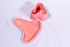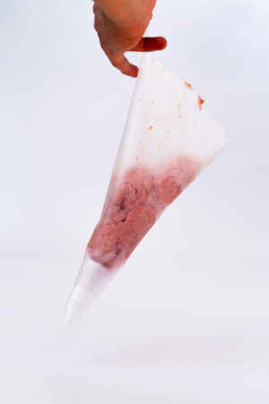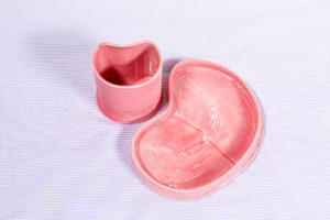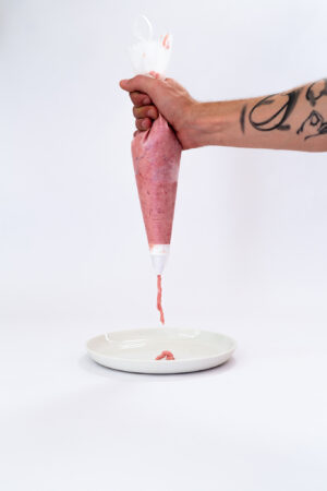The aesthetics of the meat plates and drinking vessels point to a speculative future in which meat is grown in the laboratory and 3D printed, and is even further removed from our consciousness than it is today – questioning it as a possible alternative (?) to conventional meat production.