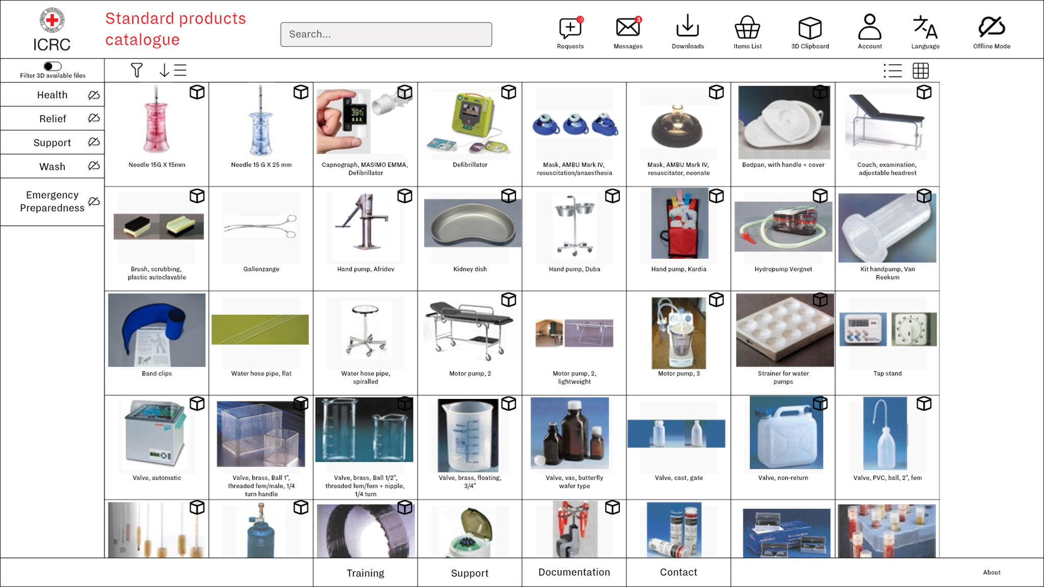 A platform based on the Red Cross Standard Product Catalogue, which lists all the products needed for crisis relief, has been developed to provide local users with access to 3D files and much more. Through the NGOs‘ headquarters, engineers and designers work on expanding, optimising and modifying these 3D files in direct exchange with the workers on site.