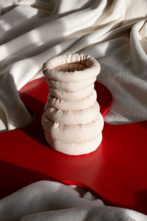 Die Vase squeeze besteht aus sieben mit Füllwatte und Reis gefüllten Stoffringen. Dadurch ist sie frei formbar, kann mit viel oder wenig Kraftaufwand geknetet oder geboxt werden und verfügt auch über ein gewisses Gewicht, sodass sie an die Wand zu werfen auch befriedigend ist.