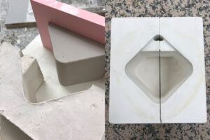 Als Material wählte ich Porzellan. Zum einen natürlich wegen seiner Unbedenklichkeit bezüglich des Umgangs mit Lebensmitteln, insbesondere heißem Wasser und zum anderen, weil es ein Material ist welches einem beim Verzehr seines Kuchens ein Gefühl von guter Qualität verschafft.