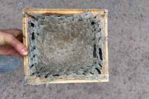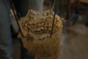 Discovering how much heat the material is able to resist was pretty interesting, especially because it barely changes after using it multiple times. Exposed to heat, the mesh becomes more stretchable and is easily transferable to different types of mold-containers f.ex. wood or metal.