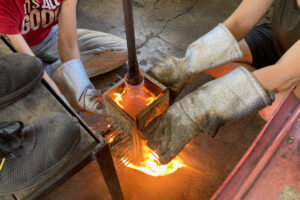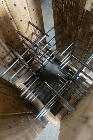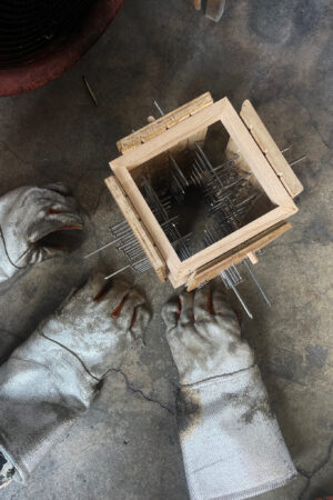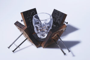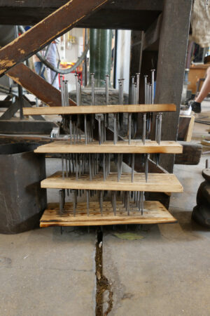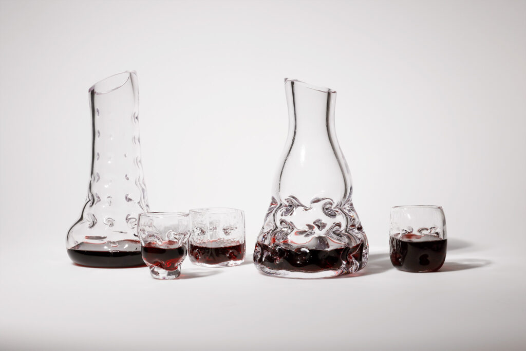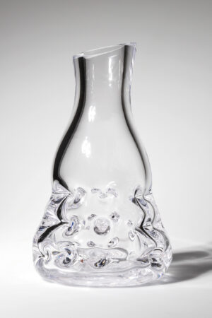 My concept is to limit the glass only partially instead of blowing it into a fixed or rotational mold. This allows for the creation of unpredictable shapes, which particularly appealed to me when working with this material. To achieve this, I built a mold out of nails. The hot, soft glass makes its way through the spaces between the nails, always creating new and unique shapes. The shape varies depending on the distance between the nails and the amount of glass used. This has resulted in a wide variety of vases, carafes, decanters, and drinking glasses. Some of the objects