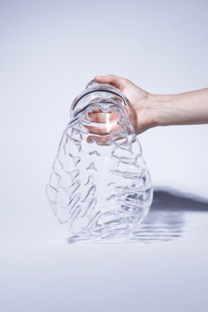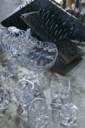 Mein Konzept besteht darin, das Glas nur partiell zu begrenzen, anstatt es in eine fixe oder Rotationsform zu blasen. Dies ermöglicht die Entstehung unvorhersehbarer Formen, was mich besonders gereizt hat beim Arbeiten mit diesem Material. Um dies zu erreichen, habe ich eine Form aus Nägeln gebaut. Das heiße, weiche Glas bahnt sich seinen Weg durch die Zwischenräume der Nägel, wobei immer neue und einmalige Formen entstehen. Die Formgebung variiert je nach Entfernung der Nägel und der Menge des aufgenommenen Glases. So sind vielfältige Vasen, Karaffen, Dekanter und Trinkgläser entstanden. Einige Objekte zerbrachen im Prozess, wodurch ihre interessante Struktur und die abstrakt wirkende Oberfläche auch von innen sichtbar wird.
