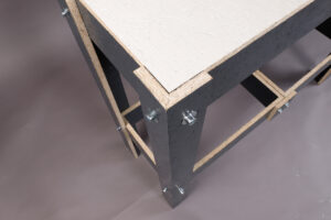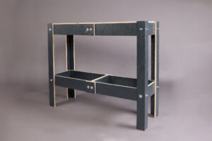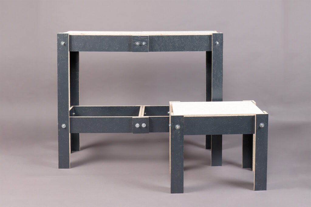 The system has been produced in a lacquered OSB which is a strong, lightweight and cost efficient material. Overall, Frame offers flexibility as it can easily be enlarged by attaching multiple frames to each other. The assembly is fast and effortless as all parts connect with the same type of hexagon socket head cap screw.