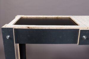 Frame is a display system built on a rectangular frame with L-profile legs attaching to its corners. The size of the frame has been based on fitting a 24 inches screen inside of it. Integration of a screen adds many possibilities to enrich the displayed item through different media such as text, videos, sound, photography and animations.