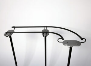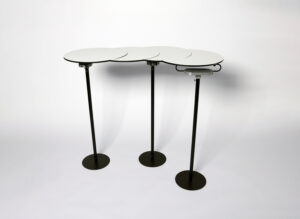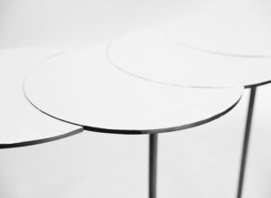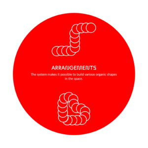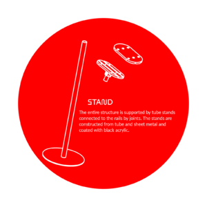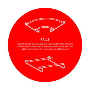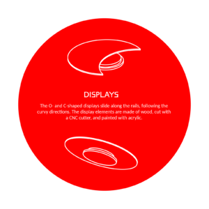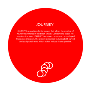 JOURNEY is a modular display system designed for creating rounded-shaped structures in exhibition spaces. The system features both curved and straight rail units, allowing for the formation of various shapes. The O and C displays slide along the rails, following the curved directions. The entire structure is supported by tube feet, ensuring stability. The display elements are made of wood, cut with a CNC cutter and finished with a primer and glossy white lacquer. The rail tubes are made of steel, bent and welded for precision. The feet are constructed from tubular and sheet metal, and both elements are coated with acrylic black paint.