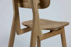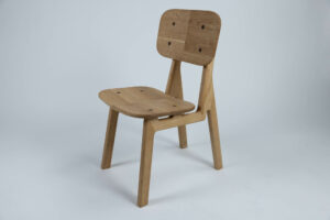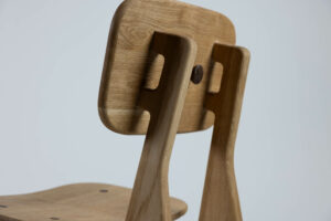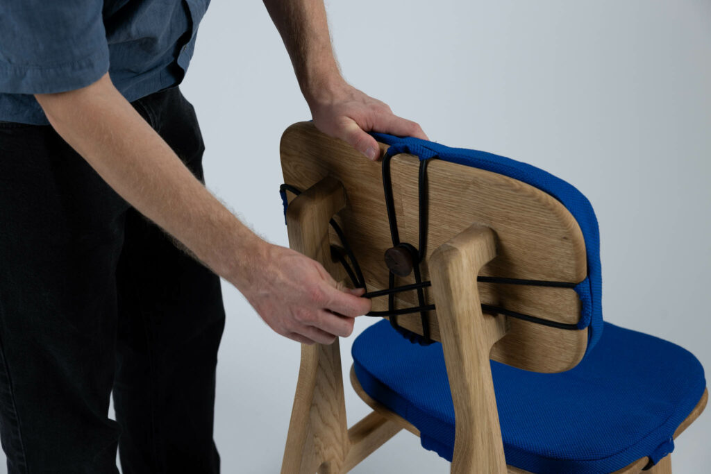 Um den ökologischen Fußabdruck so klein wie möglich zu halten, konzentriert sich das Design dieses Stuhls auf das Wesentliche. Dank eines durchdachten Gradleistensystems sind alle sechs Einzelteile zerlegbar und somit für den Versand im Flatpack geeignet. Insgesamt werden nur zwei Materialien benötigt: Massivholz und Holzleim. Durch seine Modularität ist es zudem einfach, defekte Teile auszutauschen oder zu reparieren.