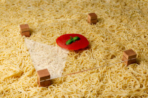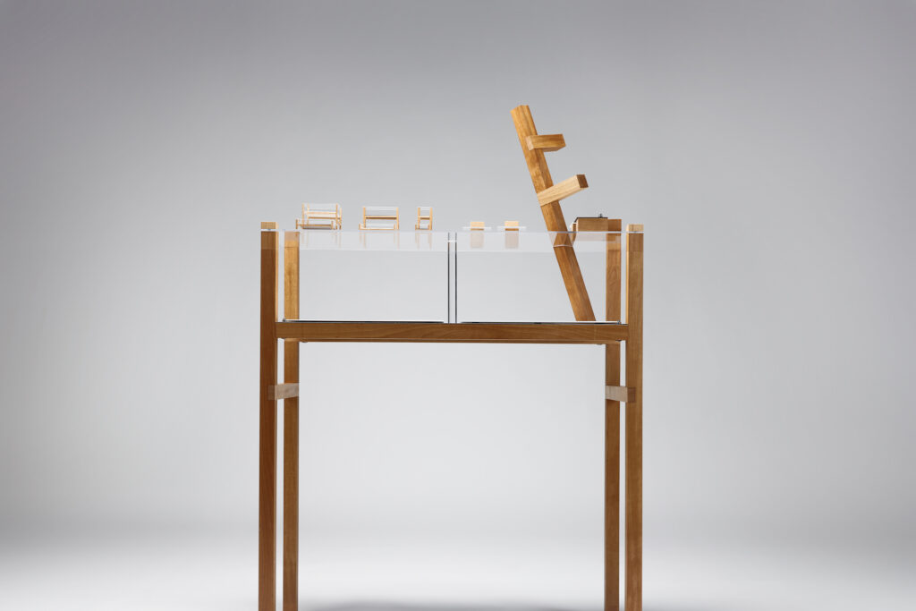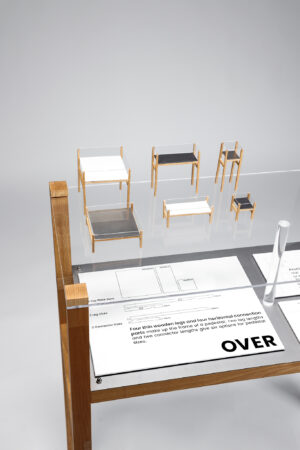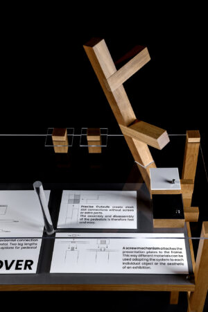 OVER is an exhibition system that lets the exhibition pieces float over their context. Connected to but still elevated from it.
