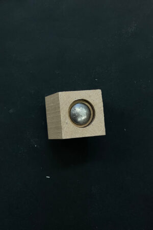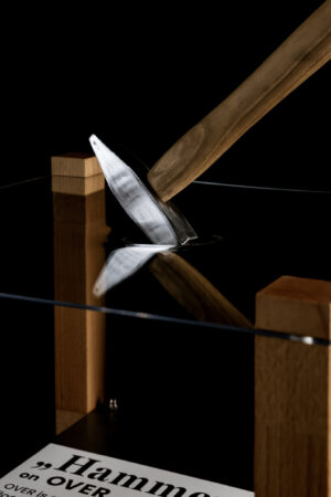 The presentation plates are attached to the frame by a screw mechanism. This way different materials can be used adapting the system to each individual object or the aesthetic of an exhibition. Laser cut or bent acrylic glass gives additional opportunities for exhibitions. A hammer seems to have forcefully deformed the plate it‘s presented on.