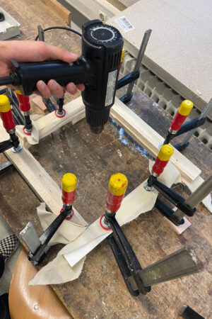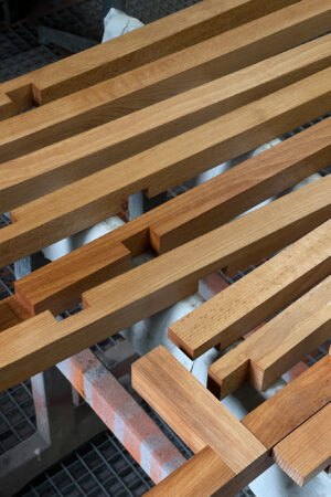 Four thin wooden legs and four horizontal connection parts make up the frame of the pedestal. This way the size is drastically reduced for transportation. Two leg lengths and two connector lengths give six options for pedestal sizes.