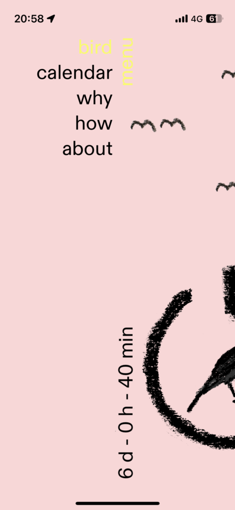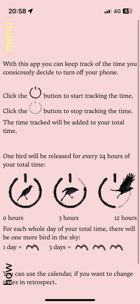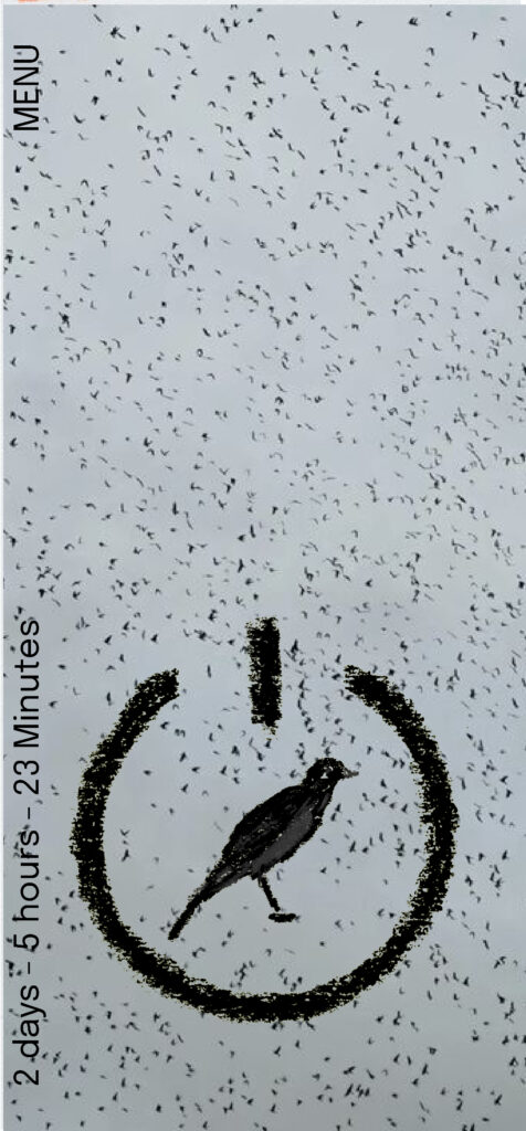 Switching off your smartphone is a radical and effective way to free yourself from these manipulative mechanisms and the smartphone’s Skinner Box. In the app Bird and Boxes, the total time that the user consciously decides to switch off the smartphone is tracked. Within 24 hours of tracked off time, an analog-drawn bird starts its flight out of the digital screen. For every full day another bird flies in the app’s sky.