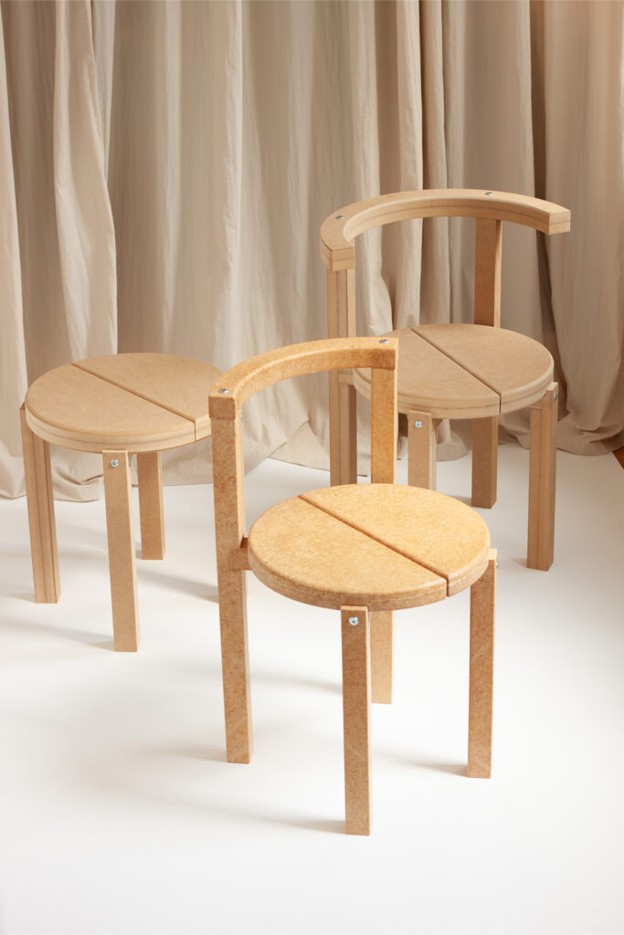 Die entwickelten Circular Design Prinzipien manifestieren sich in einer Serie zeitloser Sitzmöbel – den Hocker LC1S, den Stuhl mit Armlehne LC1A und den Stuhl mit Rückenlehne LC1B – die alle nach den Prinzipien des zirkulären Designs entwickelt wurden. Diese Möbel zeichnen sich durch ihre modulare Bauweise aus, die eine einfache Anpassung, Reparatur und Wiederverwendung ermöglicht. Das verwendete Material, eine Mischung aus Holzfasern und recyceltem Polypropylen, bietet dabei nicht nur eine ansprechende Optik, sondern ist auch robust und vollständig recycelbar.