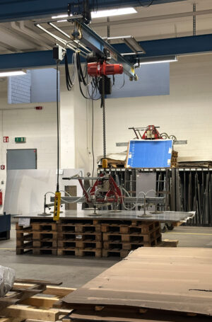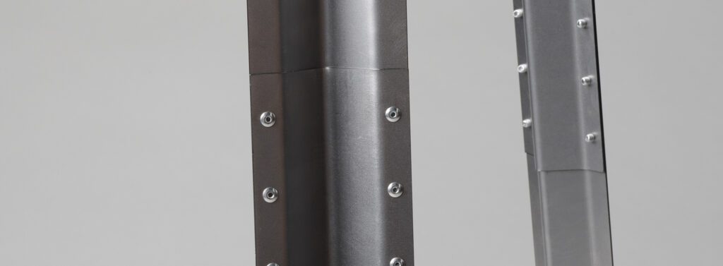 Alle Bauteile müssen zwingend auf eine Fläche von 990 x 990 mm passen, umlaufend 10 mm Rand zum Rand wobei ein Mindestabstand von 5 mm zwischen den einzelnen Teilen bestehen muss! (wg. Hitzeentwicklung beim Lasern). Die Verbindung der Blechteile erfolgt durch Laschungen und Blindniete. Kantungen werden durch ausgelaserte Perforationen (Langlöcher) vereinfacht. Die Fertigung der Blechabwicklung erfolgt bei unserem Projektpartner Ferrum Lasercut GmbH. Die Kantungen, Rohrbiegen und Montage bei uns in den Werkstätten.