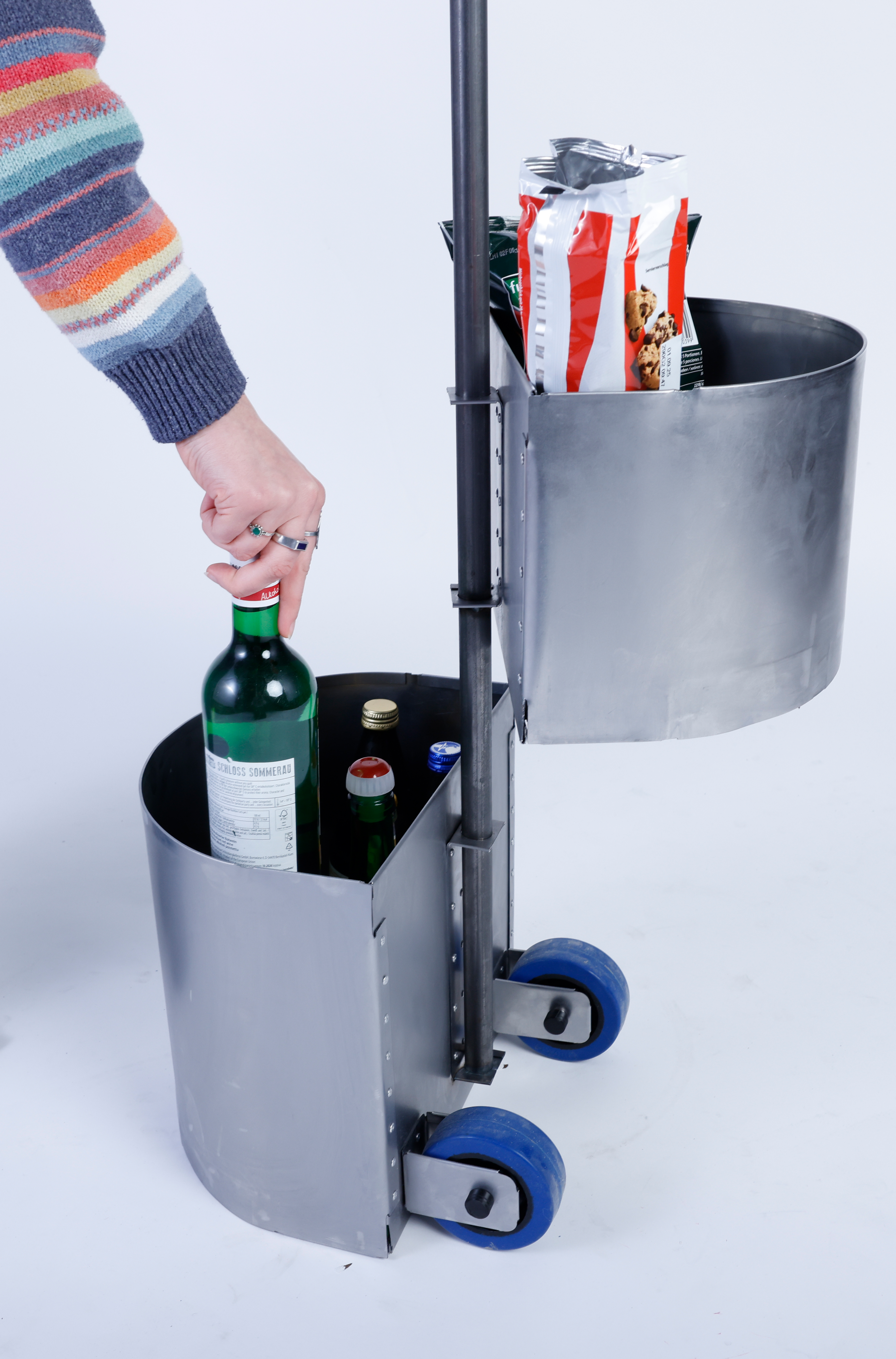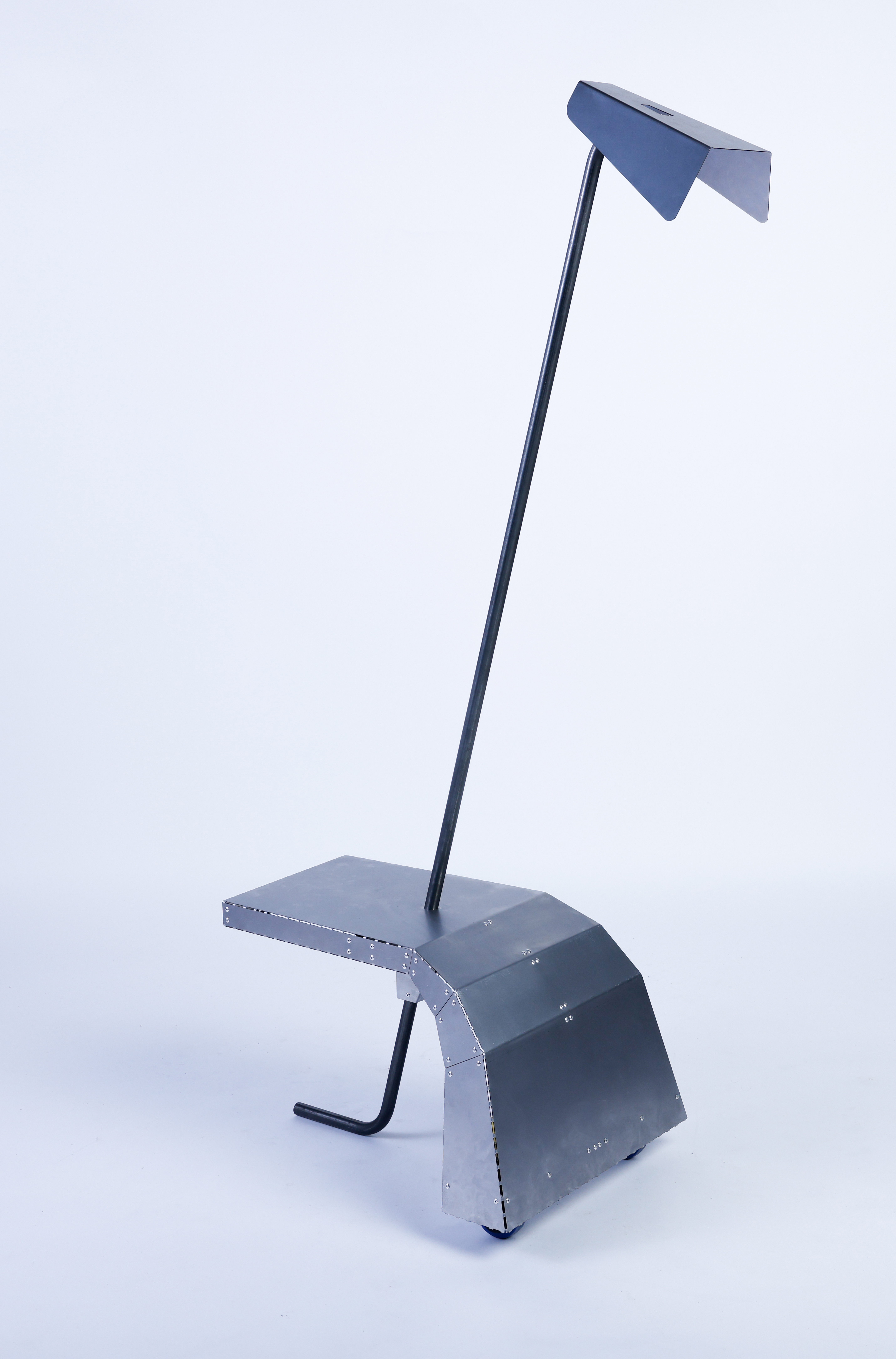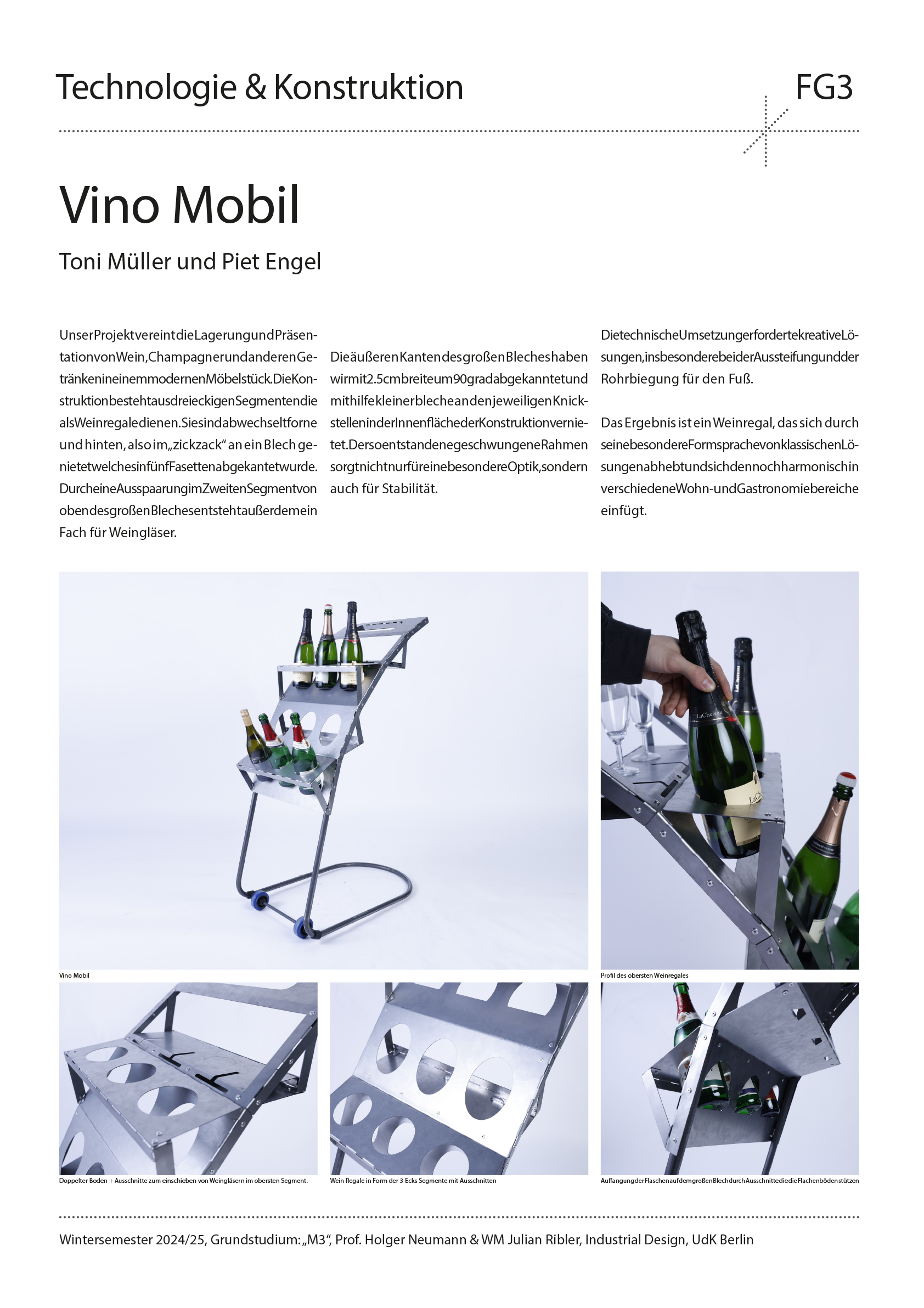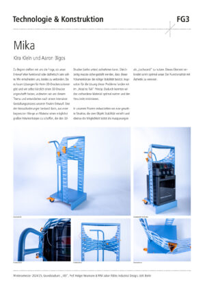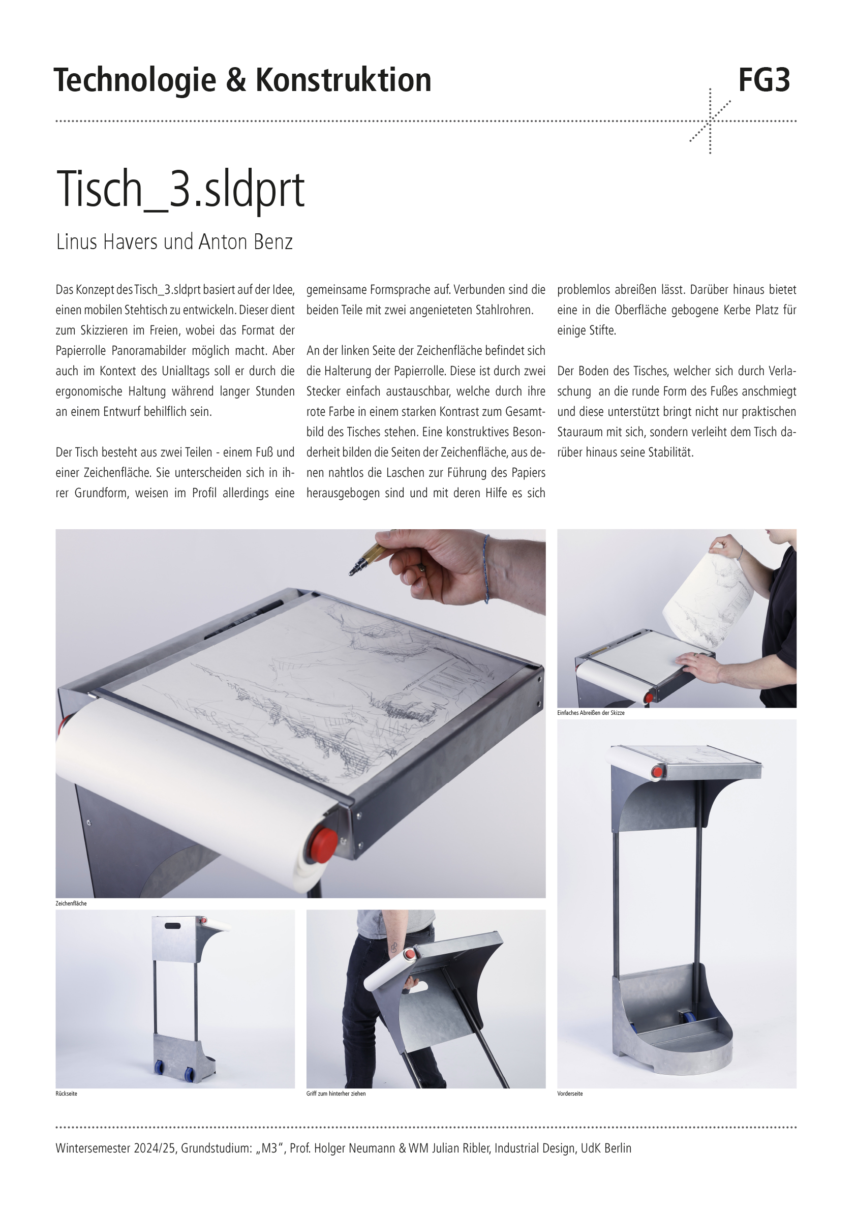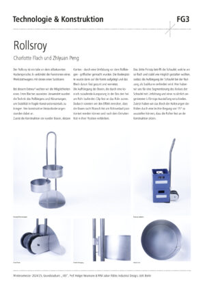 Entwerfe aus 1 m2 Stahlblech der Stärke 1 mm und 2 m Stahlrundrohr ein Metallmöbel auf 2 Rollen, das gekippt werden kann. Die Funktion und Typologie werden bewusst offen gehalten: Inspirationsquellen können sein: Werkstattwagen, Sackkarren, Kompakte bewegliche Arbeitsplätze (Sekretär), Küchenutensilo, Sitz/Steh-Hilfe, Überraschendes, Neu-Kombiniertes…etc.. Der Prozess des Kippens kann (aber muss nicht) thematisiert werden, z.B. um zwischen 2 Zuständen zu wechseln oder unterschiedliche Typologien und Funktionen zu ermöglichen. Das Rohr (2 m Halbzoll) und die Rollen sind vorgegeben. Die Herausforderung der Aufgabe besteht darin, mit sehr reduzierten Mitteln und innerhalb von Beschränkungen (sog. Design Constraints) ein sehr kreatives, funktionelles und insbesondere herstellbares Objekt zu entwerfen, zu konstruieren (solidworks sheet metal modul) und zu fertigen. Besonderes Augenmerk wird auf einen effizienten Materialeinsatz sowie eine dem Prozess und dem Material angemessene Formensprache gelegt. Gemeint ist damit eine konstruktive Eleganz, die sich aus dem optimalen Zusammenspiel von Statik, Konstruktion und gestalterischer Qualität ergibt.