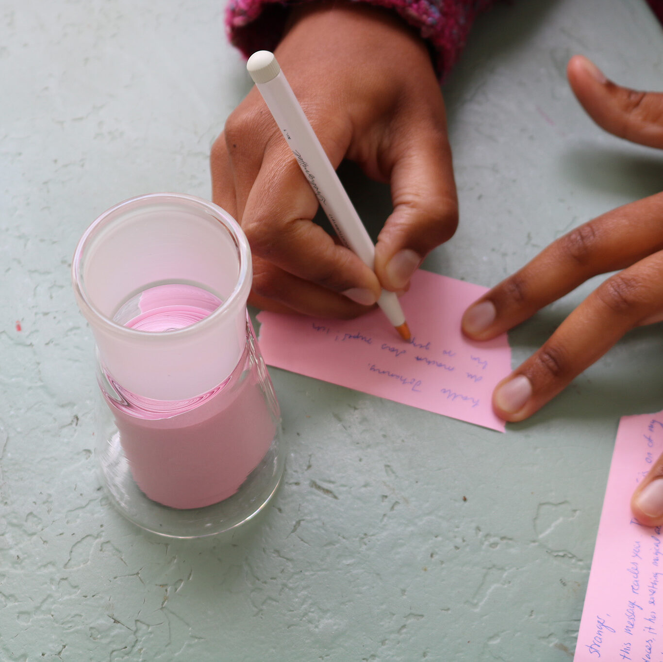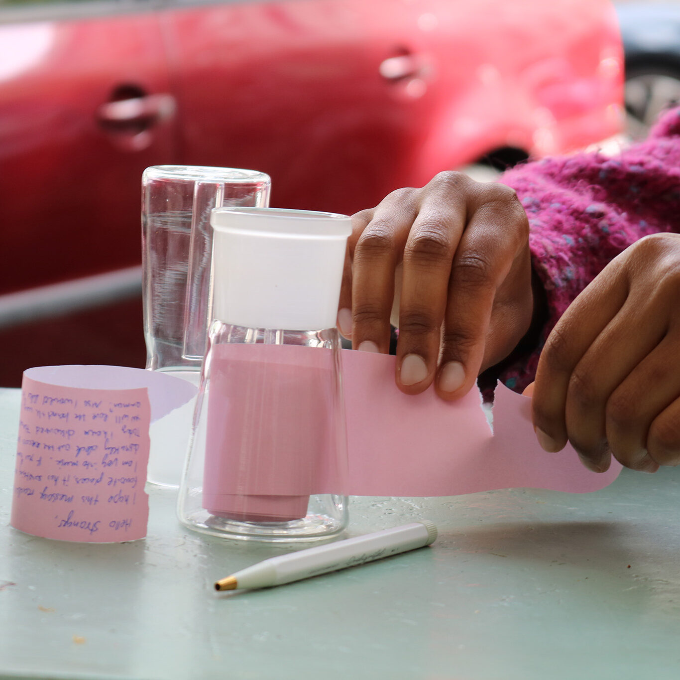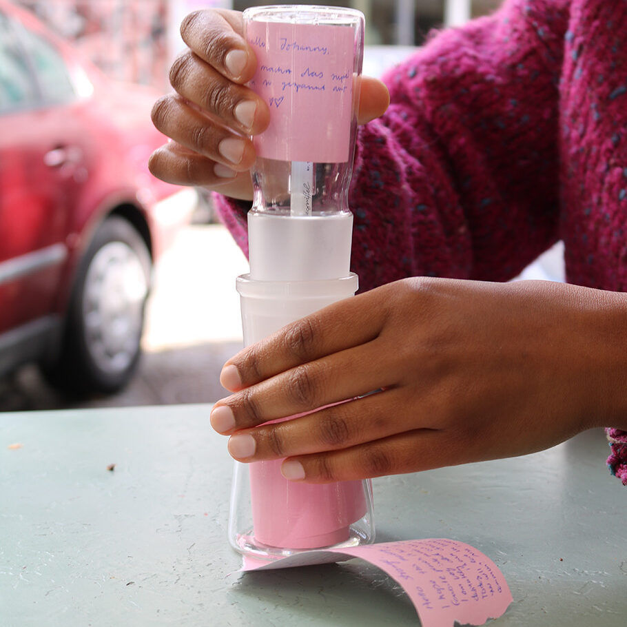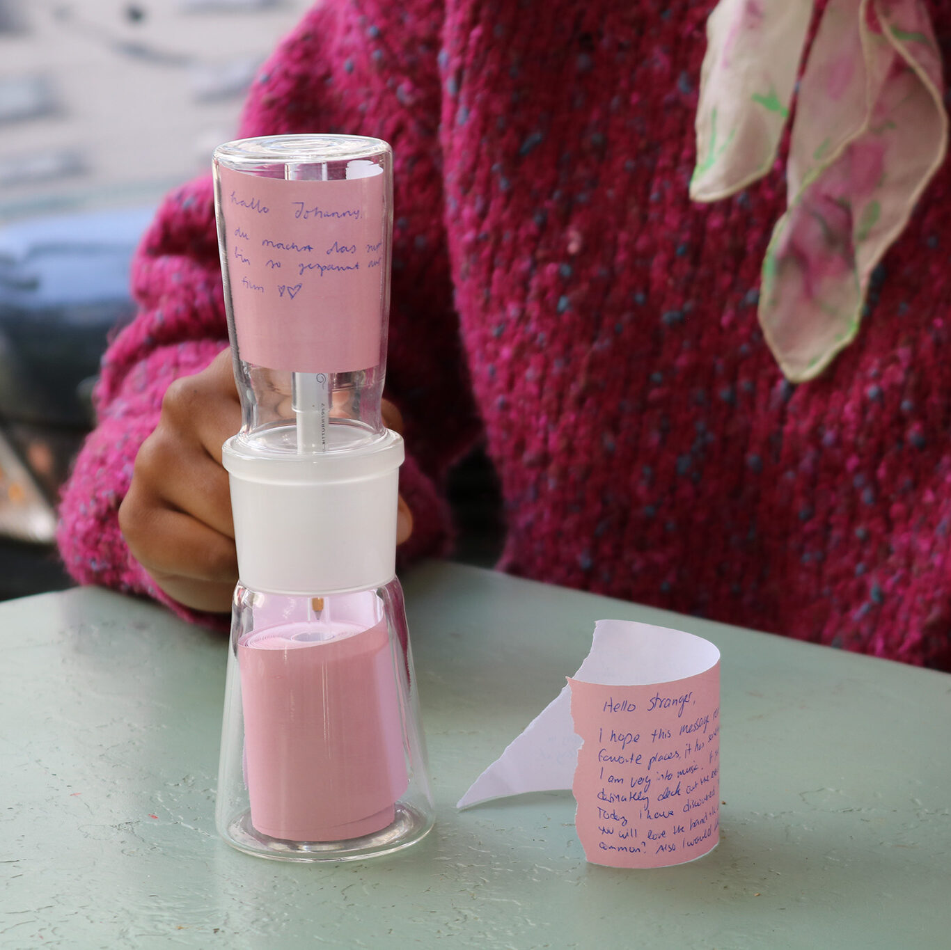 In den letzten zehn Jahren haben Algorithmen dazu geführt, dass sich Menschen zunehmend in Online-Communities mit ähnlichen Interessen versammeln, wodurch spontane Gespräche mit Fremden und unterschiedlichen Meinungen seltener werden. Message to Unknown soll vielfältige und überraschende Dialoge zwischen Bürgern fördern und ein Kribbeln, wie das eines Flaschenpost-Funds, in den urbanen Raum bringen. Im Café platziert, lädt das gläserne Objekt dazu ein, seine Hälften auseinanderzuziehen und eine verborgene Nachricht zu entdecken. Jede Begegnung wird so zu einem einzigartigen, ritualisierten Moment im öffentlichen Raum.