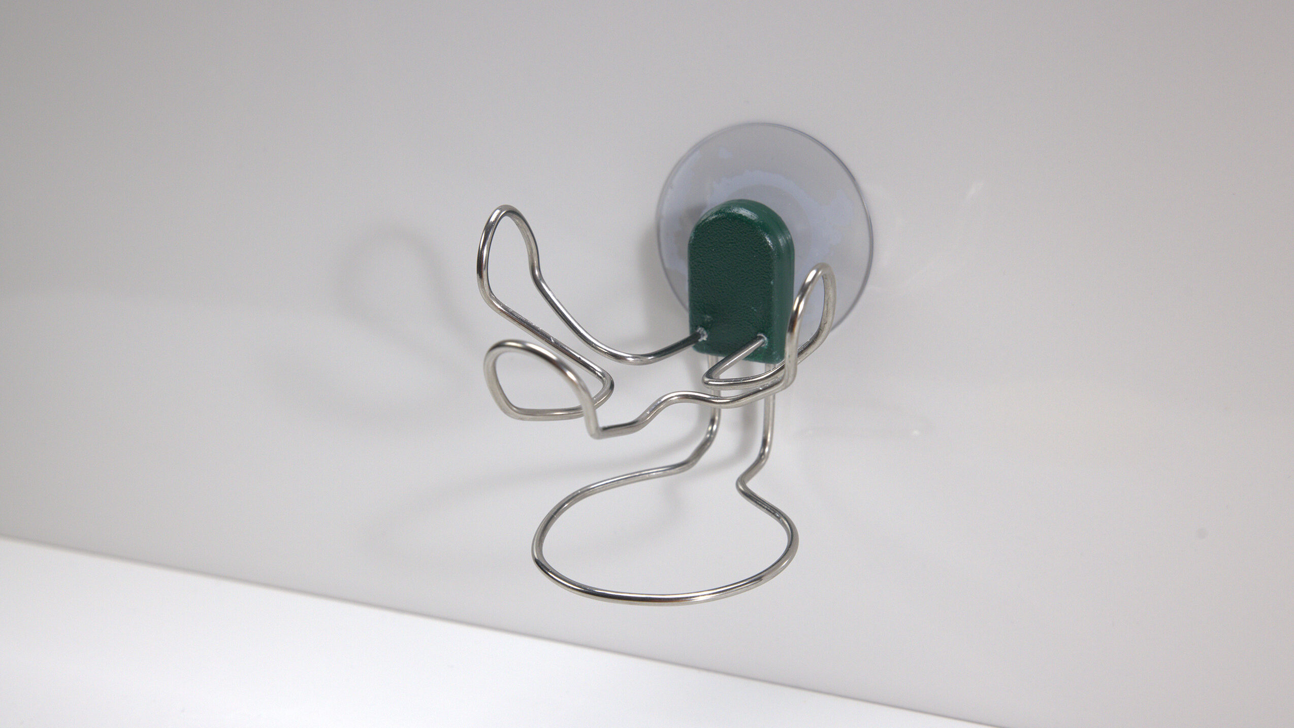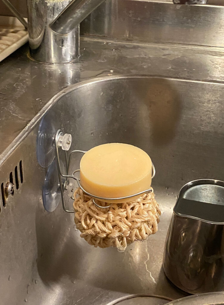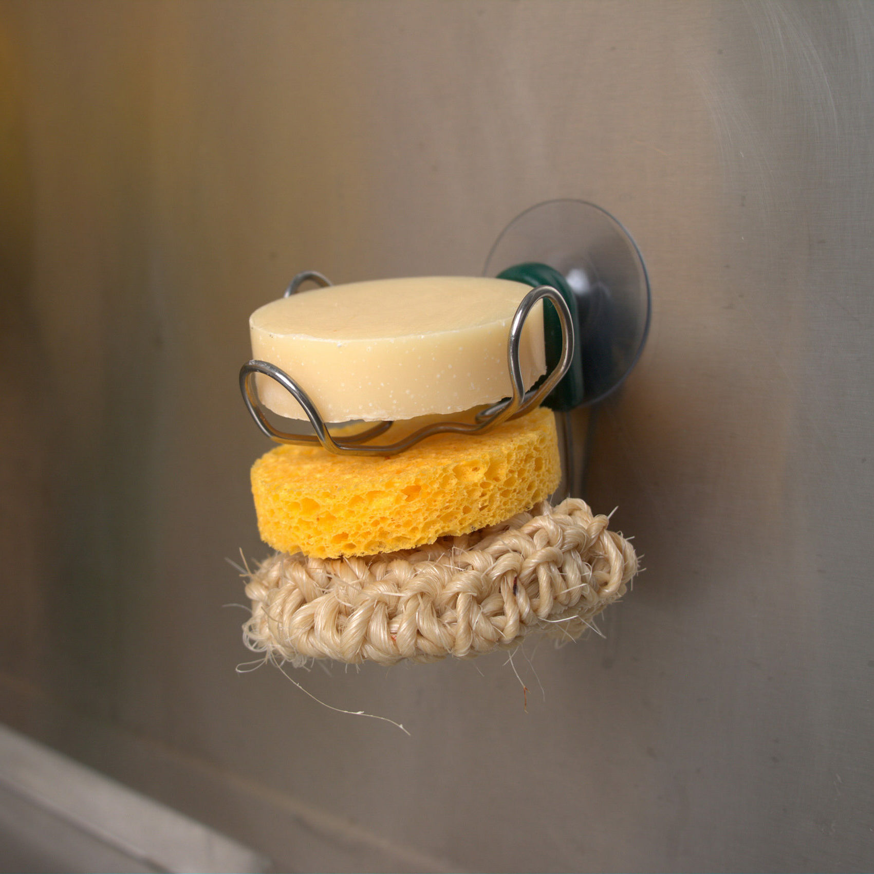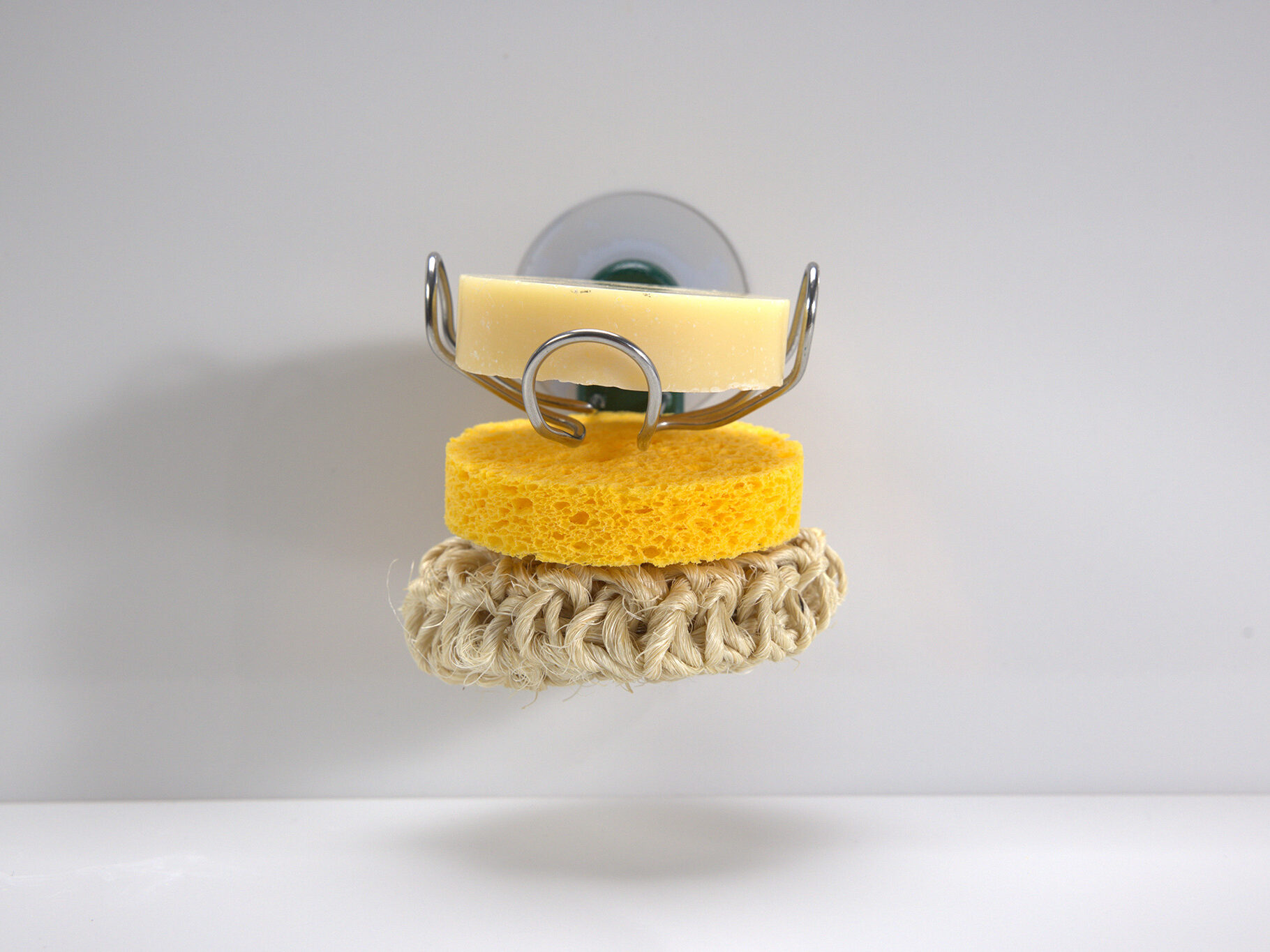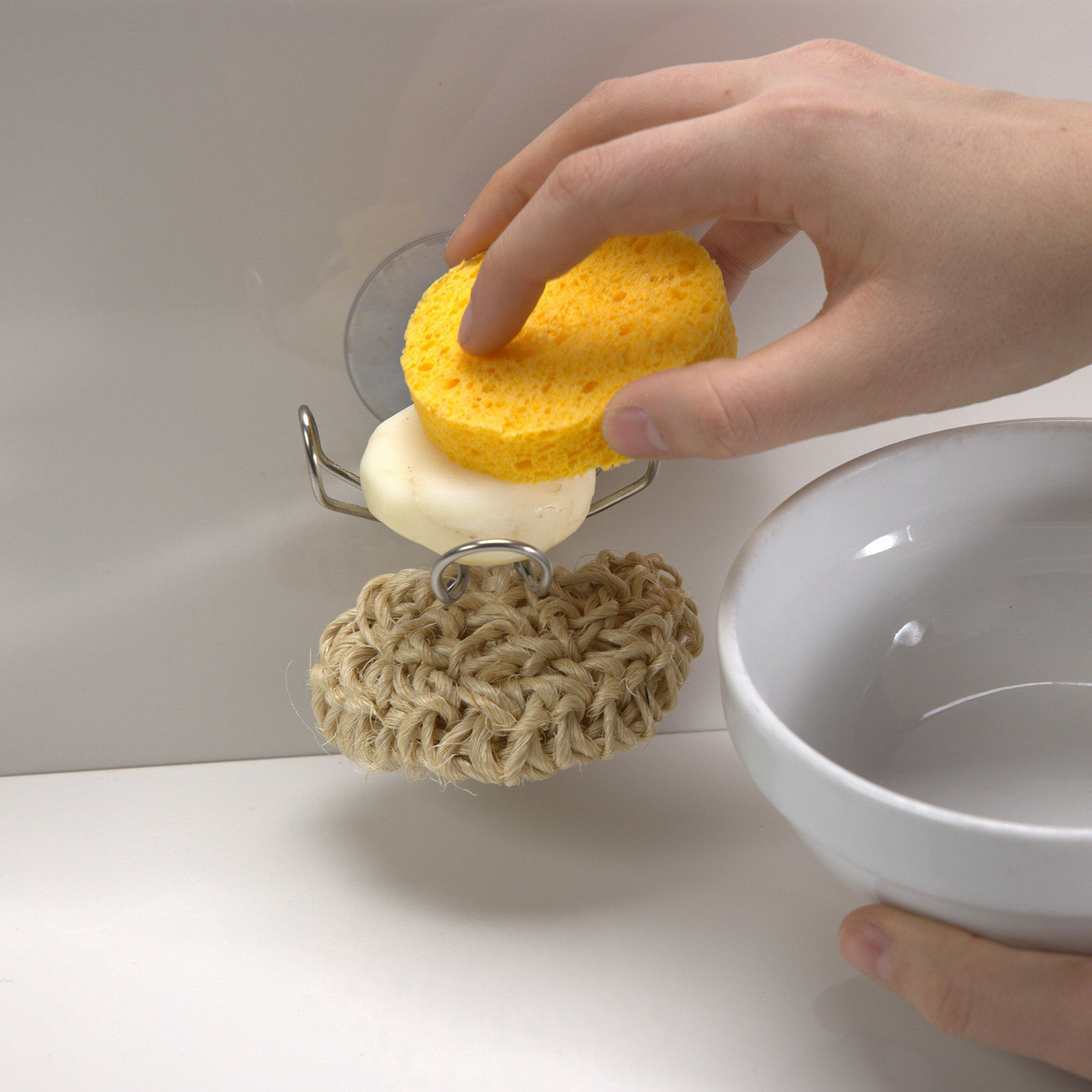 A sleek, bent-wire stainless steel holder with a suction cup for flexible placement in or around your sink. It holds a solid dish soap, a cellulose sponge, and a crochet sisal scrub pad. Positioned below the soap, the sponge and pad absorb drips for maximum use. Since they are separate, each can be replaced individually, reducing waste. A clean, sustainable solution for an eco-friendly kitchen.