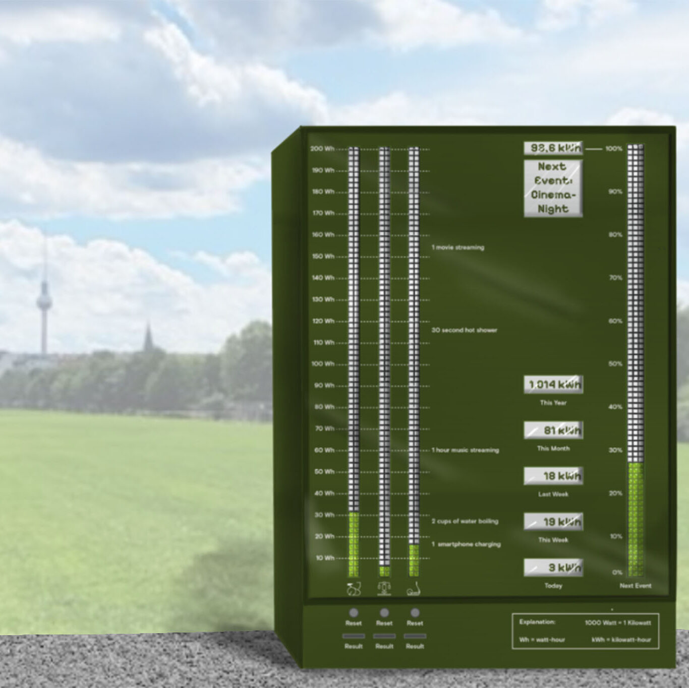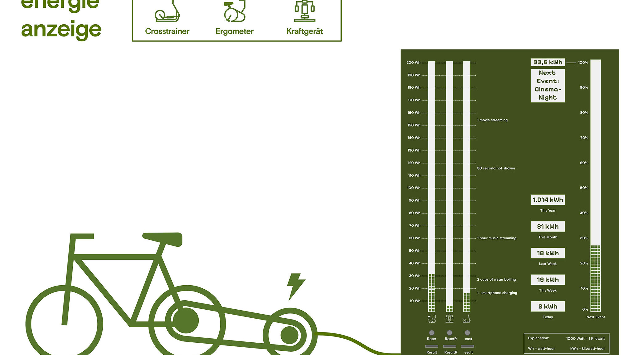 In my concept, the fitness areas in parks are equipped in such a way that human power is converted into electrical energy. This is used to organise community events once the energy target has been reached. A display board provides information on the amount of energy produced. This playful approach promotes motivation and awareness of sustainable energy.